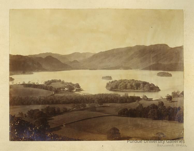 The landscape photo is of Derwent Lake in the lake district area of England. There are 3 small islands in the middle of the lake, two small ones on top and one bigger one at the bottom. The lake is surrounded by mountains and the bottom of the picture is of farming landscape.Photograph Details