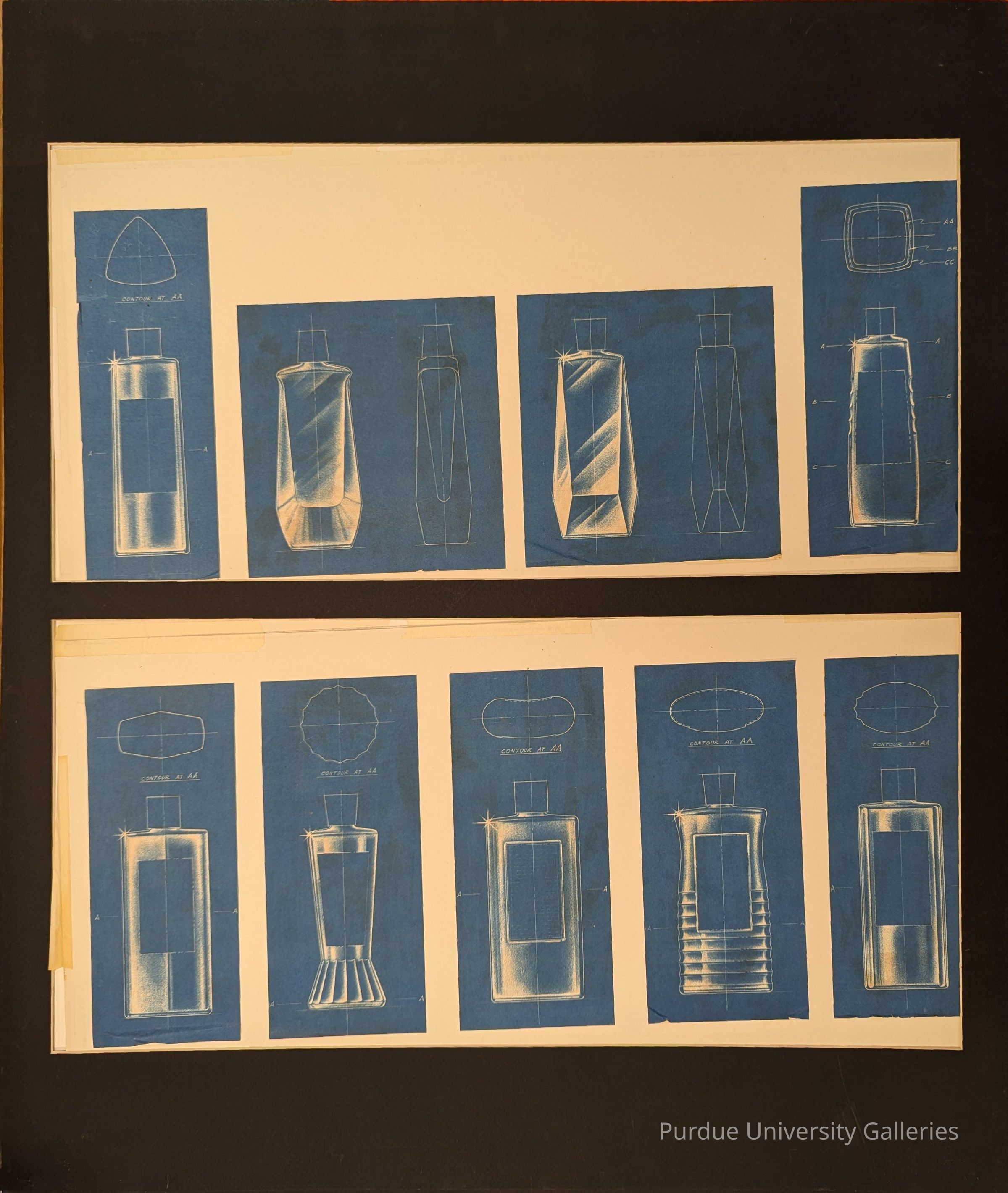 Blue and white prints of water bottles with front shaded views and side or bottom shape view.Collection