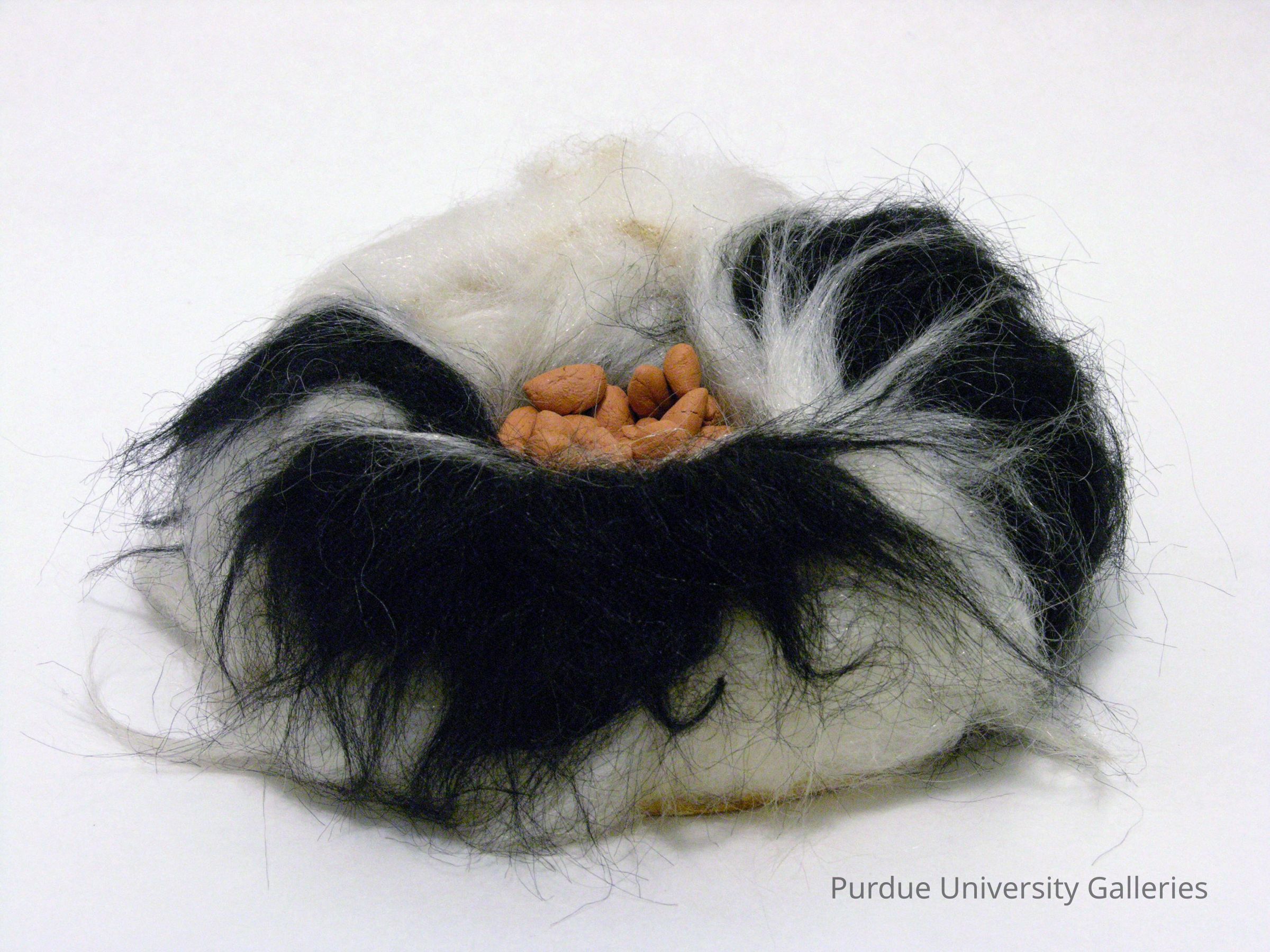 This sculpture abstractly resembles a dog food bowl. The bowl seems to be made of a felt or fur. The bowl itself has colors of white and black similar to a dog's pelt. The inside has a different portraying dog food.Type of Sculpture