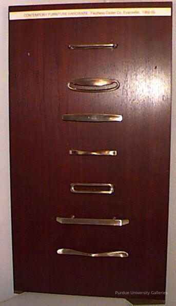 Brown wooden board with seven silver-looking handles for cabinet doors. All of the handles have different styles and designs. The top of the board has a white label that says "CONTEMPORARY FURNITURE HARDWARE Faultless Caster Co. Evansville, 1960-65".