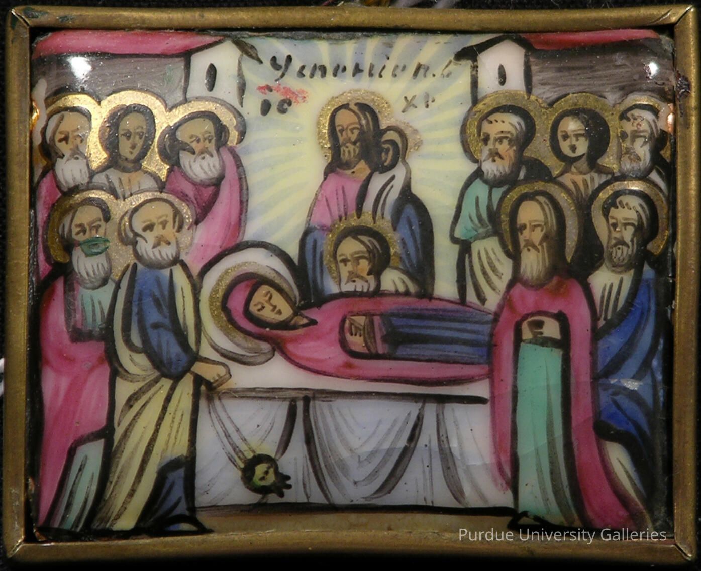 This diminutive plaque, suspended by a hook at the top, represents a condensed, provincial version of the Dormition theme. The essential iconographic elements are present, with Christ’s mandorla depicted as numerous rays of light emanating from this figure, and with two plain buildings appearing in the background. The figures have shortened, doll-like proportions, and bright colors of pink and green predominate along with gold in the haloes. There is no room for the angels usually seen with Christ.