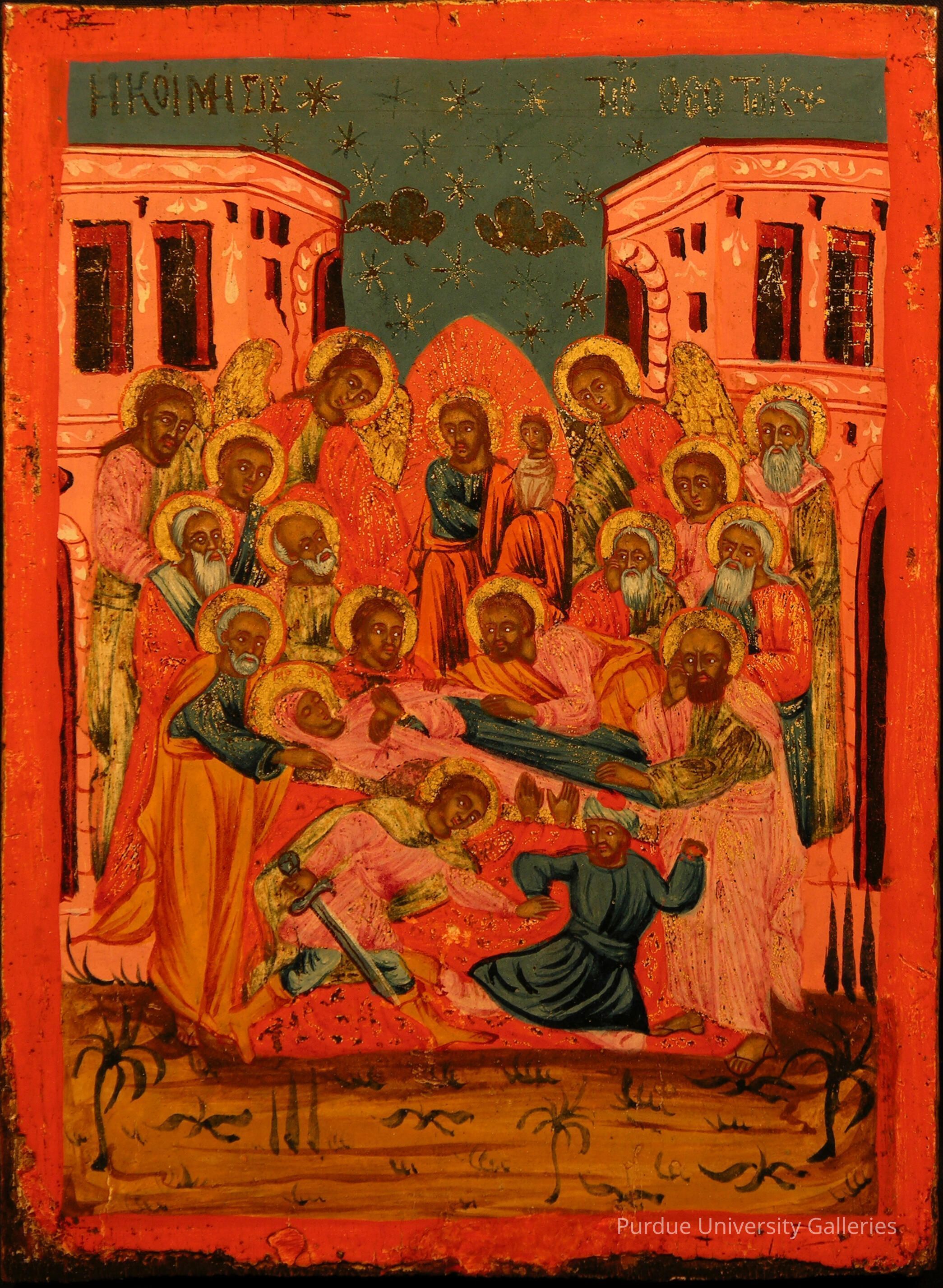 This is a traditional rendering of the Death of the Virgin, in which she lies upon her bier surrounded by Christ in the middle, the Holy Apostles, and angels. As Christ gazes at his mother, he holds a child representing the Virgin’s soul, to be taken to heaven by little angels floating in the sky above. Around Christ is a cone-shaped mandorla, colored orange-red. An architectural setting frames the background, and in the foreground the Archangel Michael cuts off the hands of a Jewish priest who tried to disrupt the gathering; this figure’s wounds were later cured miraculously. The colors are very rich, with lavish gold for haloes, angels’ wings, and stars in the sky. In front of the figures is a barren landscape. The raised border is painted red.