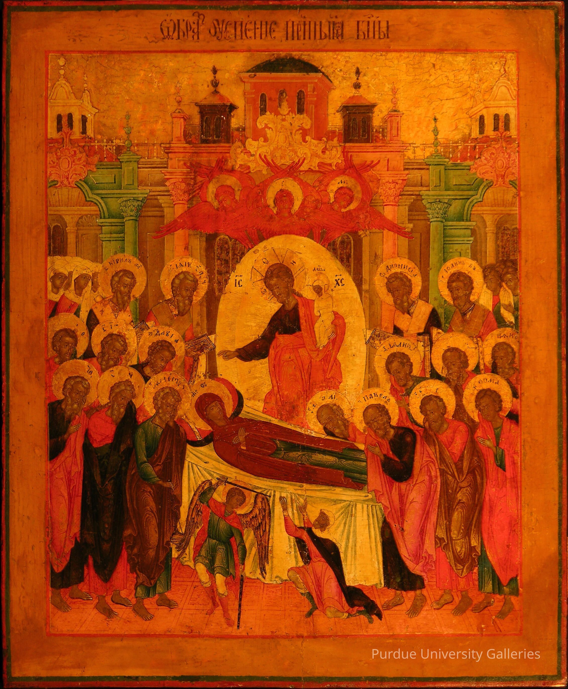 Tempera painting on curved wood panel. This panel features a red, green, and mustard yellow border. There is a Cyrillic script caption in brown at the top. The focal image features a deceased Mary on a white burial shroud in red cloak and blue dress. Behind her stands Christ in brown and orange robes with his right hand outstretched and a child in his left. There are three orange angels above him. On the left of the painting at Mary's head are eight male Apostles and a winged angel with two black swords. On the right is a small kneeling man and an additional nine male Apostles.Type of Painting