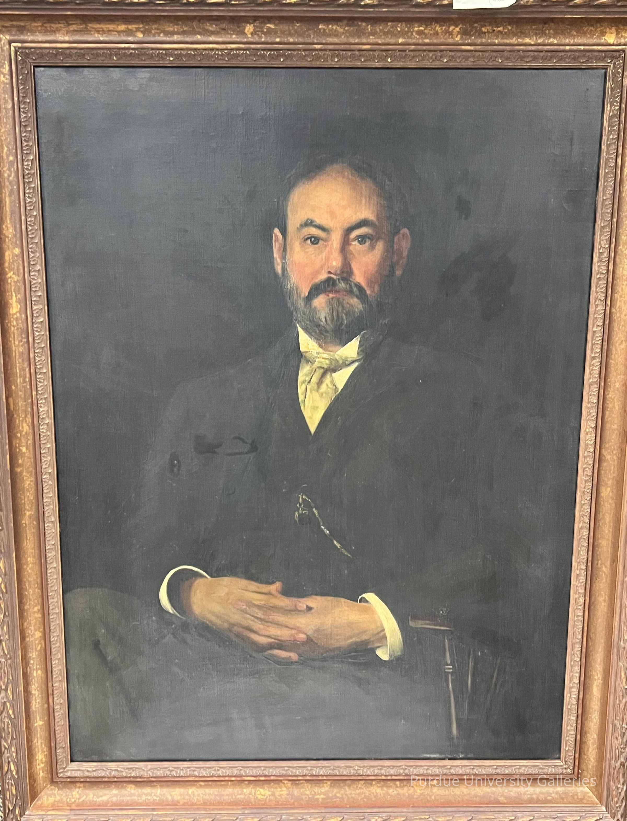 A man, Dr. Wiley, is depicted in the center of the picture seated in a wooden chair. He folds his hands and crosses his legs, while looking directly at the viewer. The main focus and emphasis is drawn on the man.Type of Painting