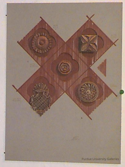 a drawing of drawer panels, the panels have different designs on them, most of the designs resemble flowers with one at the bottom left being similar to an antique door knocker.Type of Drawing