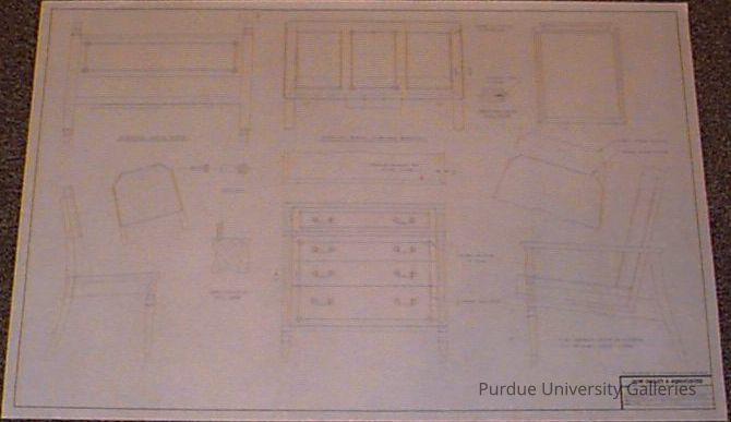 Technical orthographic drawing of chairs, dresser, nursing home bed, and hospital bed. Italian Provincial Group #4