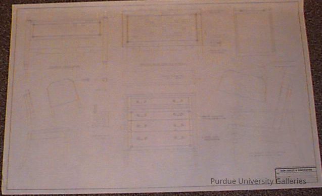Technical orthographic drawings of chairs, dresser, nursing home bed, and hospital bed. Italian Provincial Group #3