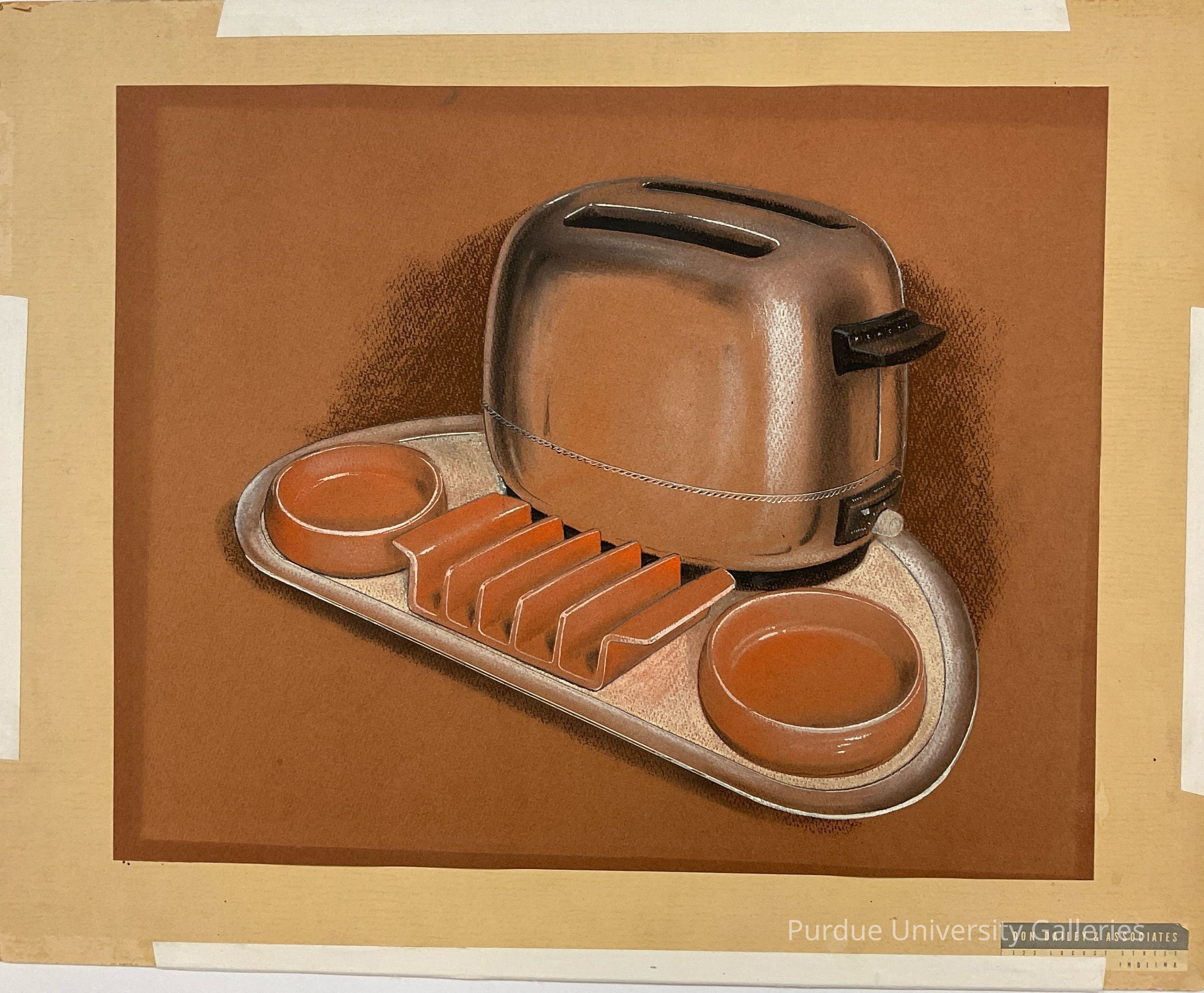 Drawing of a toaster and serving dishes (2 bowls and 1 bread holder) placed on a crescent shaped tray. Tan backing board has a gray and white sticker int he bottom, right corner “Don Dailey & Associates, 123 Locust Street, ???, Indiana. Tape covers the city’s name, but it is probably Evansville.Acquisition