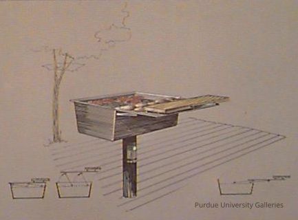 Perspective drawing of rectangular-shaped grill with cover that moves to become counter space. 3 orthographic side views demonstrating movement of cover from closed to open.Acquisition