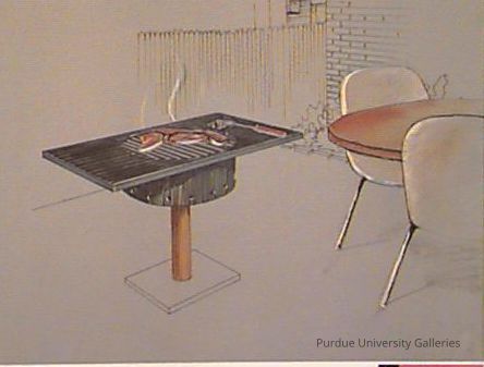 Rectangular topped grill with round firebox/bottom vent and cylindrical pole. Food, table, chairs, and spatula were drawn on other paper and glued on.Acquisition