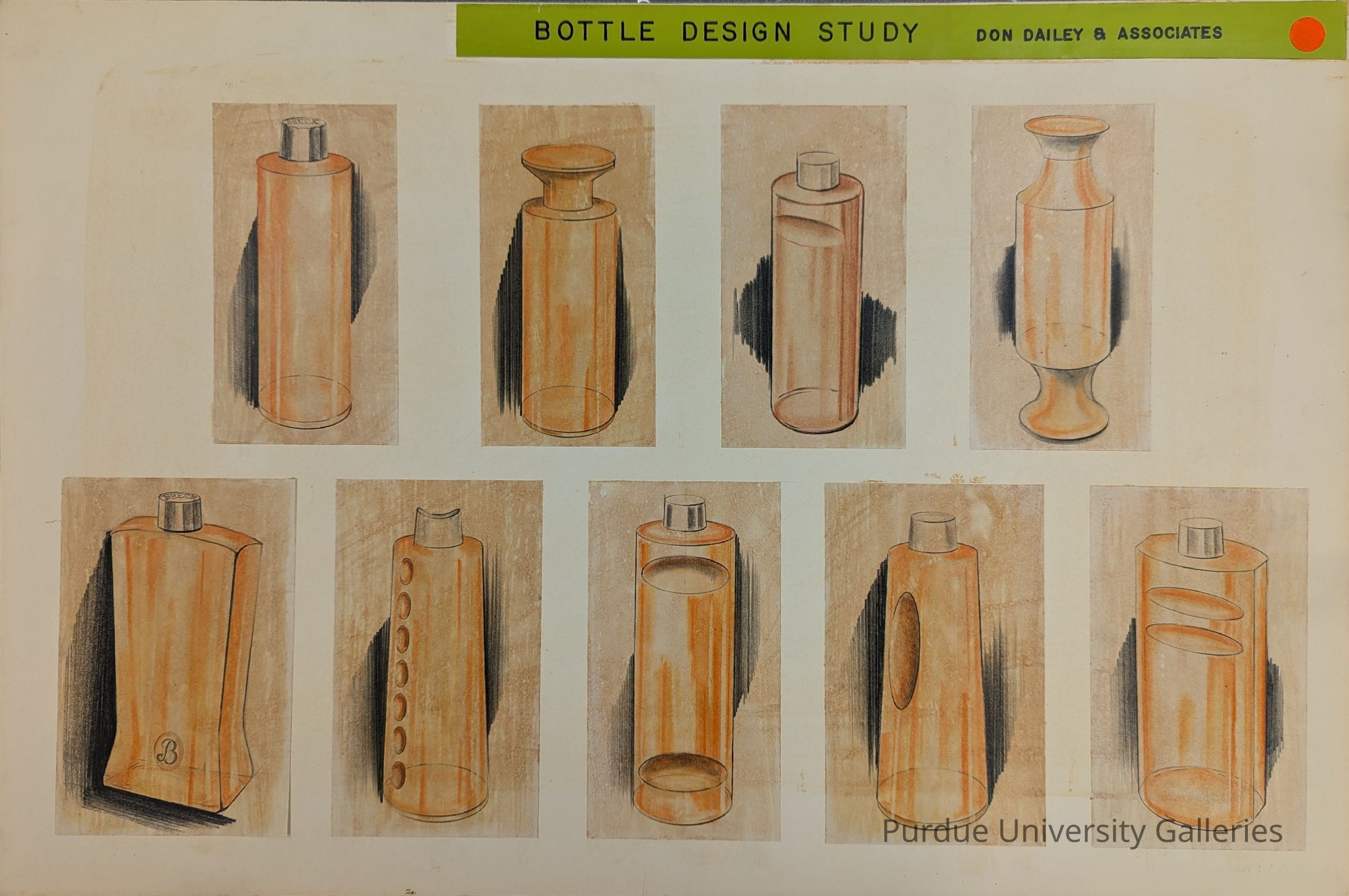 Drawing of 9 different bottle designs. Very similar to 1997.03.046.01, but the bottle designs are different and there is a bright pink sticker in top right corner. Label at top reads "BOTTLE DESIGN STUDY Don Dailey & Associates"Collection