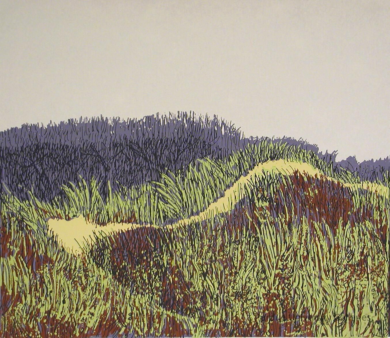 "Robert Browning Reed attended Indiana University, where he received his Bachelor of Fine Arts degree in 1948, and in 1950, he received further training at the Escuela de Pentura y Escultura in Mexico City. Shortly afterward, he returned to Indiana University to obtain his MFA degree. Reed started teaching at Purdue University in 1958 and retired in 1987, after serving twenty-nine years in what was then called the Department of Creative Arts. Reed’s prints can be found in over 150 private and institutional collections, and they have been shown in over 150 national, international, and regional exhibitions. Reed’s technique has changed from woodcuts to prints made in the intaglio and serigraphy techniques; the print entitled Indiana Dunes, South Shoreline is done in the silkscreen method. It was produced during the middle part of his career. This print depicts one of the many sites in the Indiana Dunes State Park, and it shows wild grasses growing atop the sand. The viewer can see a path within the dune, probably part of one of the many trails in the State Park. The top quarter of the landscape represents the skyline, and the rest of the image is composed of the dune itself. The colors Reed used to create this image are matte in tone, something typical of serigraphs. Shades of purple, green, and burgundy enhance the plant life; yellow is used for the sand; and a light pink depicts the skyline. Black breaks up the solidity of the colors and emphasizes details. Quick strokes depict individual blades of the tall grasses. The South Shore image creates an impressionistic effect in its subtle polychromy. Reed specialized in landscape imagery in much of his printmaking. This work is a landmark in the world of printmaking of the American Midwest. Indiana Dunes, South Shoreline complements the woodcuts Robert Reed made of the Wabash River and all of these images represent regions in Reed’s home state of Indiana. The images of the river shore, done primarily in a single color, contrasts nicely with the matted flat colors in the South Shore image. One difference between Reed’s Wabash images and his print of the dunes is that the South Shore scene appears impressionistic vis-à-vis the more straightforward Wabash images. The manner of depicting the grasses in the South Shore image suggests they were drawn rapidly onto the silkscreen. By contrast, the Wabash images feature realistic detail, visible, for example, in the architectural background of Wabash II.