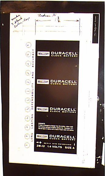 Image of a 0.4"=1" scale wrap design for a Mallory "DURACELL CLOCK BATTERY". Clocks with the hour hand in different positions run along the left side of the white area, above "LONG LASTING DEPENDABILITY AND ACCURACY".
