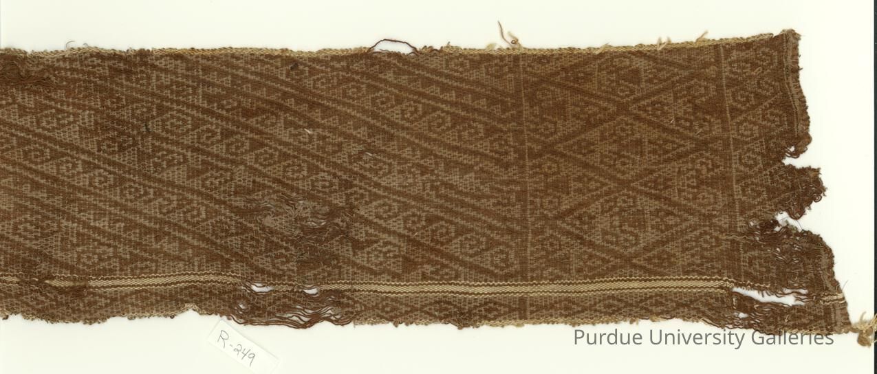 Fiber, cotton. Textile fragment with stylized bird motifs in chancay pick up technique. Colors include brown and tan.Acquisition