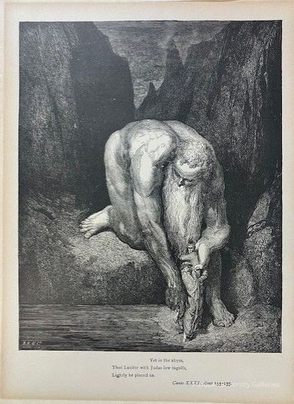 Print from a book with a large bearded, naked man holds 2 men in his hands as he kneels along the ground of a canyon. Man in the foreground is dressed in robes and is looking at this right hand in front of his face, with the naked man holding his left foot. A second man is between the robed man and the naked man's hand. In the bottom, left corner of the image is "B.H. & C." Below the image is a partial poem "Yet in the abyss, That Lucifer with Judas low ingulfs, Lightly he placed us. (Canto, XXXl., lines 133-135).Acquisition