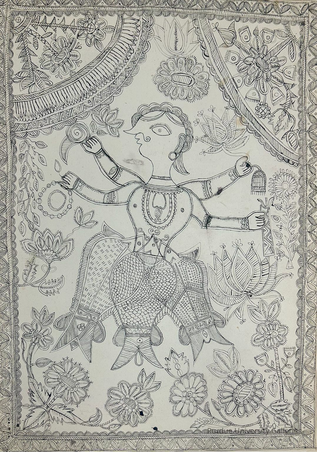 The painting depicts a central figure with a human upper body and a fish-like lower body. The figure has multiple arms, each holding different symbolic items, and is surrounded by detailed floral patterns and geometric designs.Type of Painting