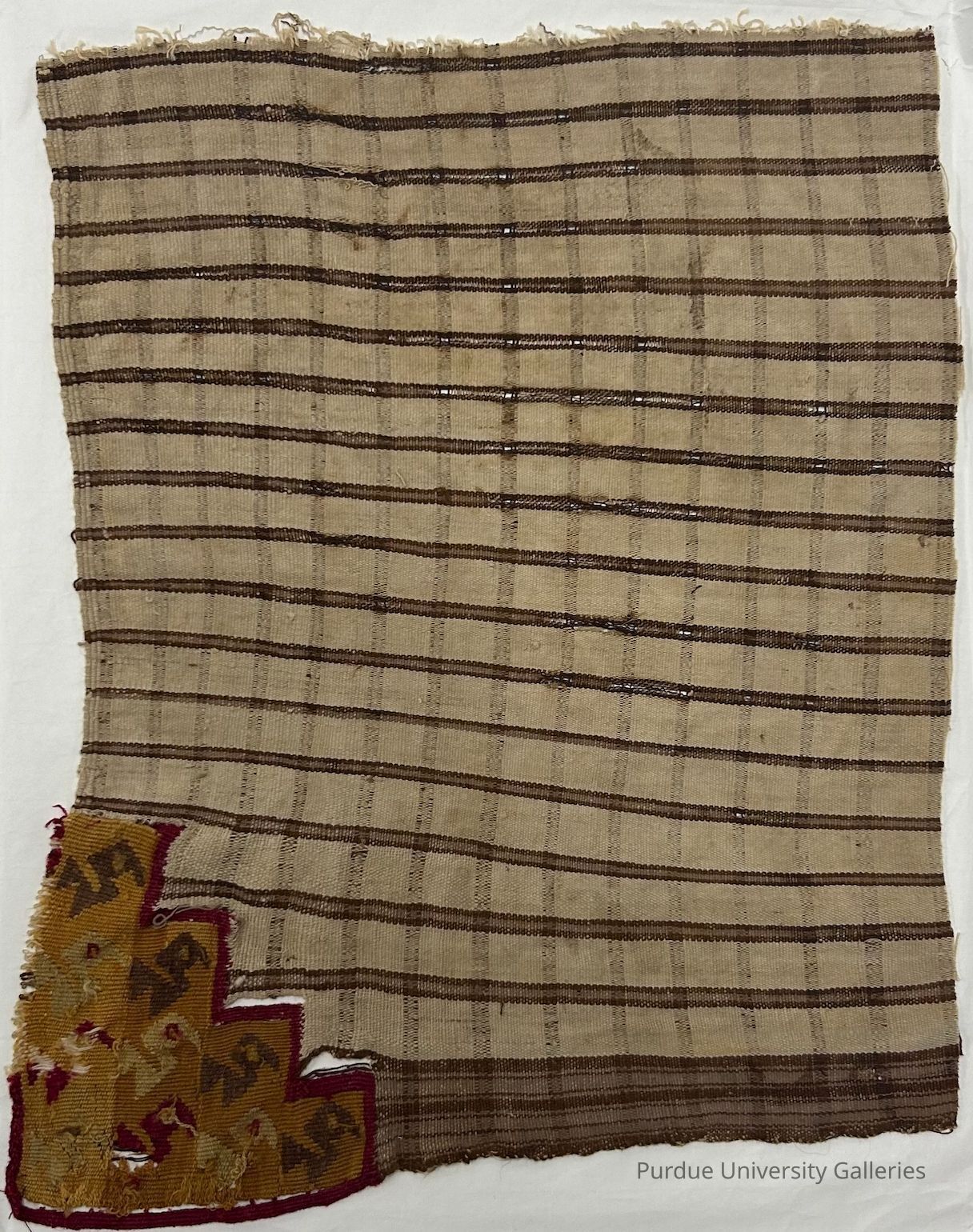 Textile fragment of striped plain weave panel with tapestry weave corner containing bird motifs. White, brown, red, gold, and black.Acquisition