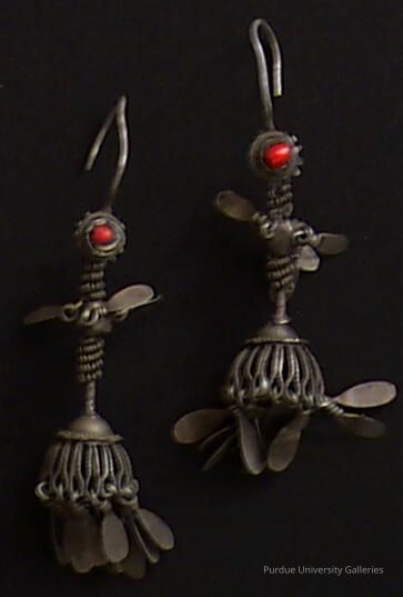 These earrings are typical of those created by the Turkoman silversmith’s elegant usage of their limited techniques. By drawing and cording the silver they often created a dangling effect, and elaborated the accessories with brightly colored glass, beads, or stones.