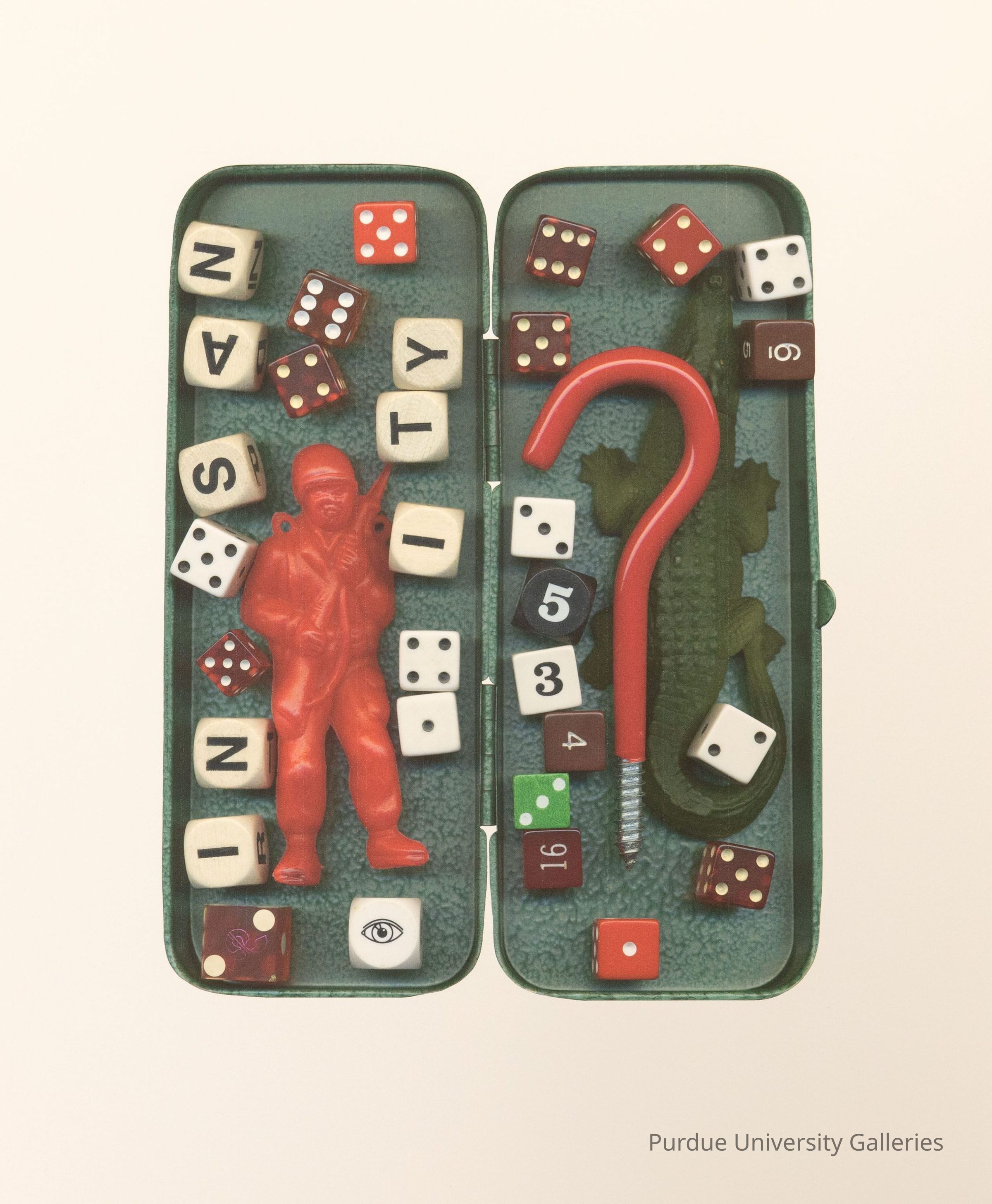 Green case that is open. On the proper right side are letters that spell out "insanity" along with 6 die and a plastic, red, army man. Below his proper left foot is a dice with and eye on it. The proper left side has die with printed number (6, 534, and 16) and 8 die with dots on them. a red hook is on top of a green crocodile. Along the bottom edge of the paper in pencil is written "Edge of Reason, 19/24, Kathryn Reeves"Type of Print