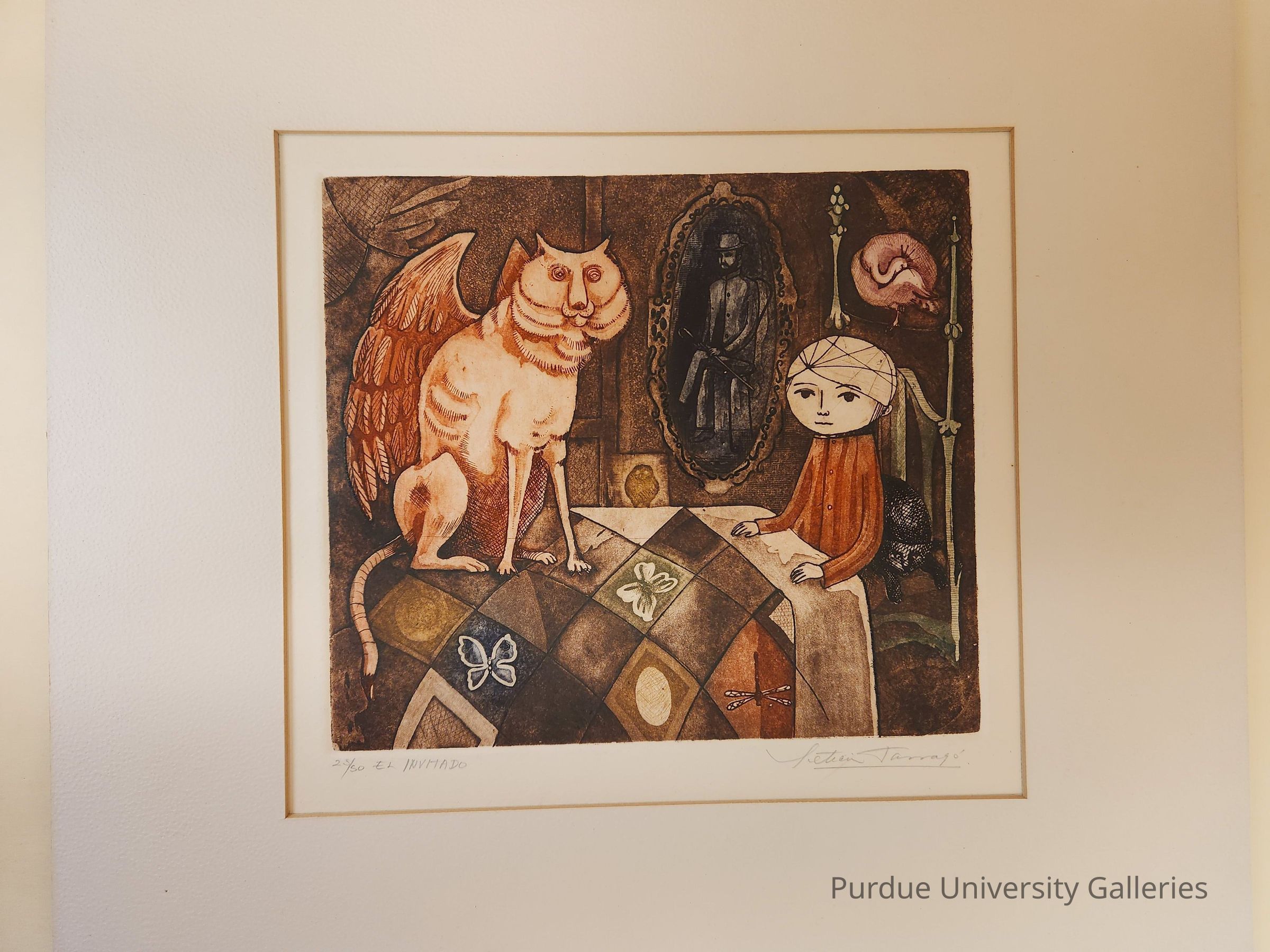 A peculiar ink drawing of a wounded boy siting upright in his bed, staring at and odd monster perched. The winged cat stares back at the boy. In the room hangs paintings with a bird sleeping on his bed frame.