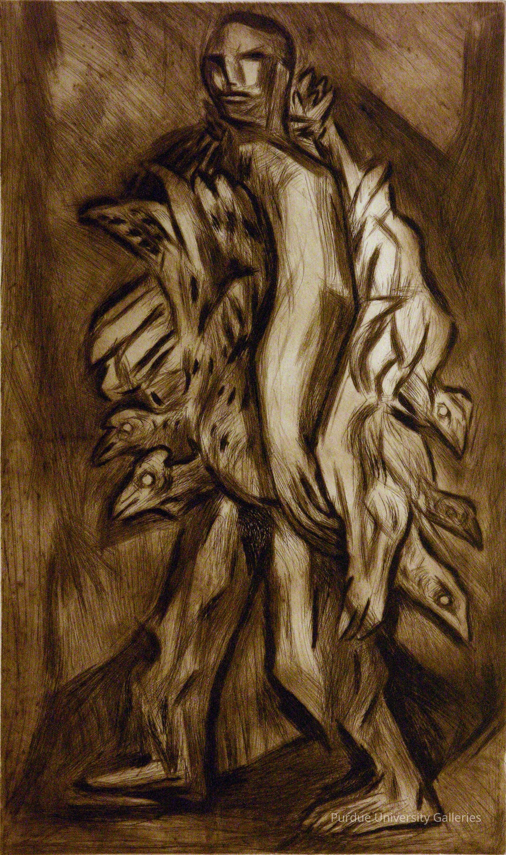 It is evident that Zalce’s style evolved drastically over time, moving farther away from the realism of his early etchings and murals to a more expressive, geometric style. This is in contrast to the very clean, commercial aesthetic of the Pop Art and Minimalist movements of the time. Another work from his later career which shares this new expressive quality is titled Rapto (Rape) dated 1969. At first it is difficult to discern where the figure of the woman and the figure of the man begin and end. The figures of the woman and man are also comprised of chaotic lines like that of the chicken vendor and the sense of depth is created using the figures shadows rather than placing them in an identifiable setting.