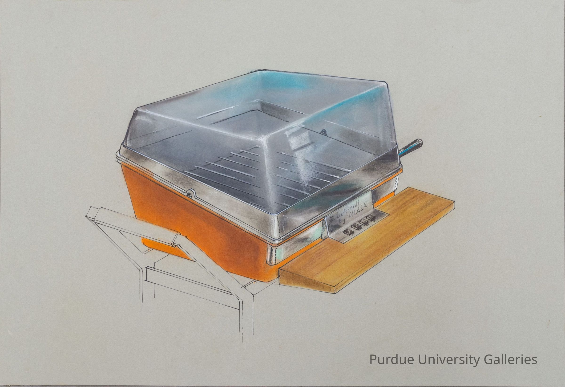 Orange grill with a clear cover and a wooden plate on the front. Buttons above the wooden board adjust the heat output. The metal plate where the bottons are says "ELECTRIC BAR-BEQUE by AKRLA". The grill is on a metal stand with a metal handle. The drawing was placed on a dark gray poster board. An orange "Don Dailey and Associates" sticker is on the bottom right-hand corner of the poster board.