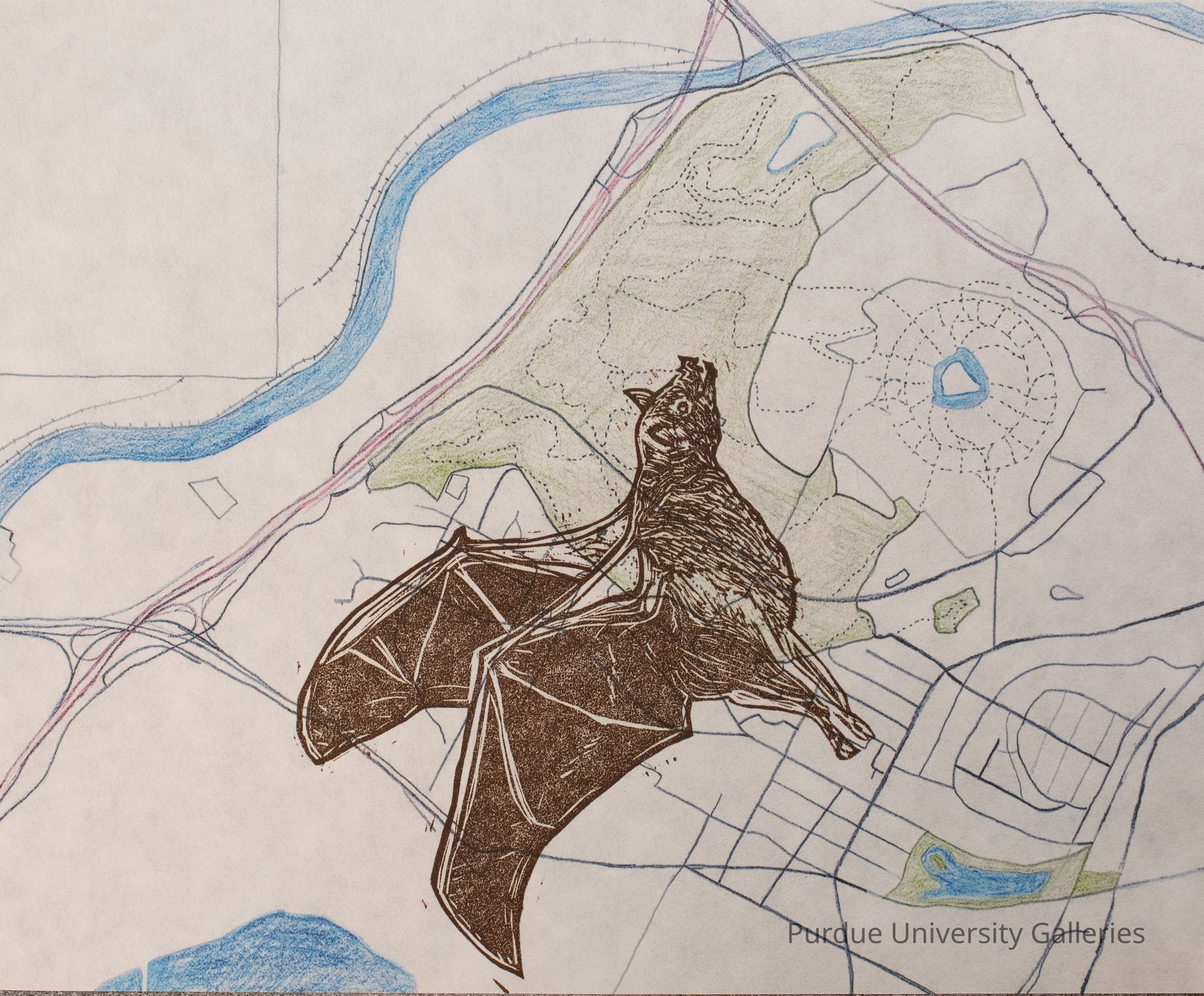 8" x 10" printed paper of a hand drawn urban map from over head with a bat imposed over the city and park areas. A blue river extends from the bottom right corner to the upper center edge. On the back printed in pencil from left to right "14/20," "Elysian Park," "K. Pinto."