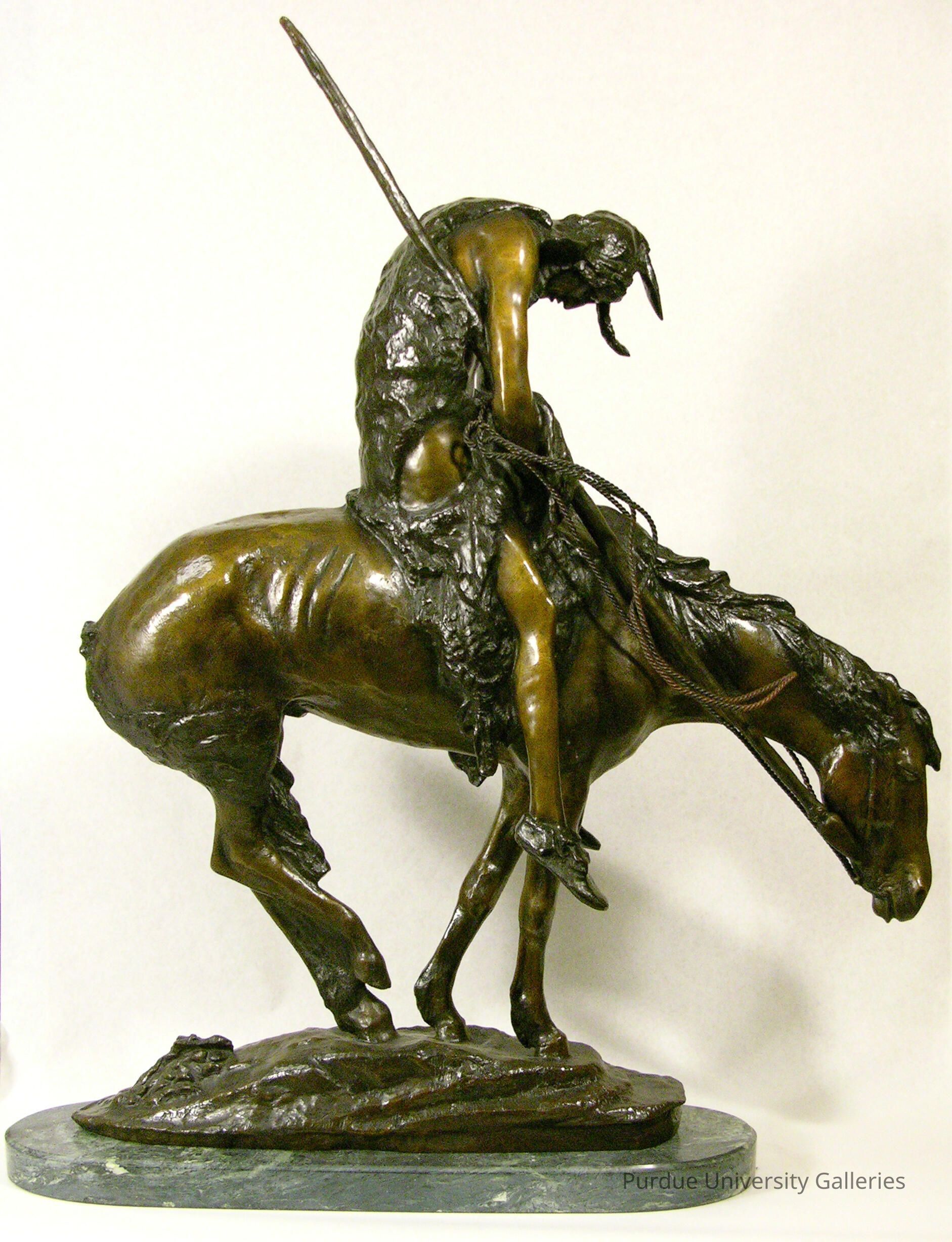 Instead of a fierce warrior, Fraser chose in this sculpture to show the transformation of the once proud Native Americans into a spiritually broken and subjugated people. A strong wind blows from behind the horse and warrior who both bend forward and submit without a fight to overwhelming forces; this underscores their physical, mental, and emotional suffering. The warrior’s spear hangs low, weighing him down as it rests beneath his right arm. This shows that he is no longer capable of fighting and his spirit is shattered. He wears moccasins on his feet and his legs hang limply on either side of the horse. Neither the rider nor the animal attempts to resist the external or internal pressures acting upon them and they submit with a slumping pose. This sculpture depicts the exhausted and defeated state of Native American peoples who have reached the end of their trail. It serves as an icon not only art historically but also for the present-day Native American tribes, who can identify with the torment of their ancestors.