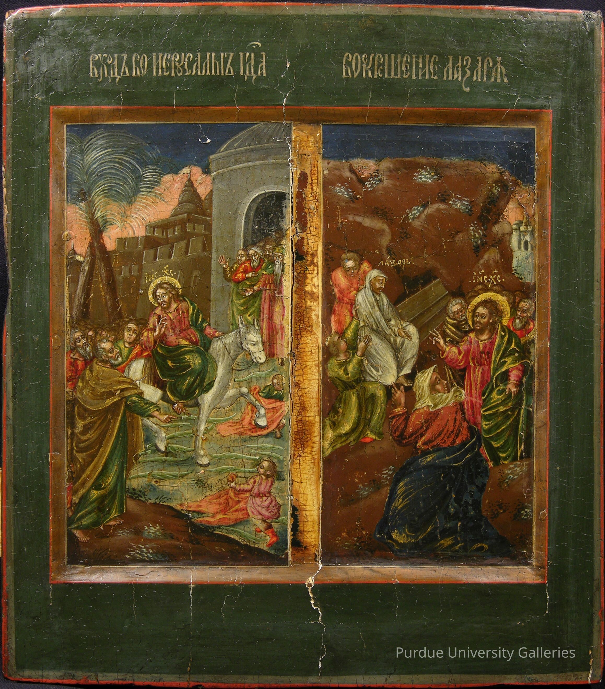 Mixed technique of oil and tempera on curved wooden panel bordered in red and dark green before lowered image. Two Cyrillic captions sit on the top. There are two images side by side. On the left, Jesus rides through town on a white horse clothed in green and red robes. On the right, he stands with onlookers outside as a man clothed in a white burial shroud comes forward.Type of Painting