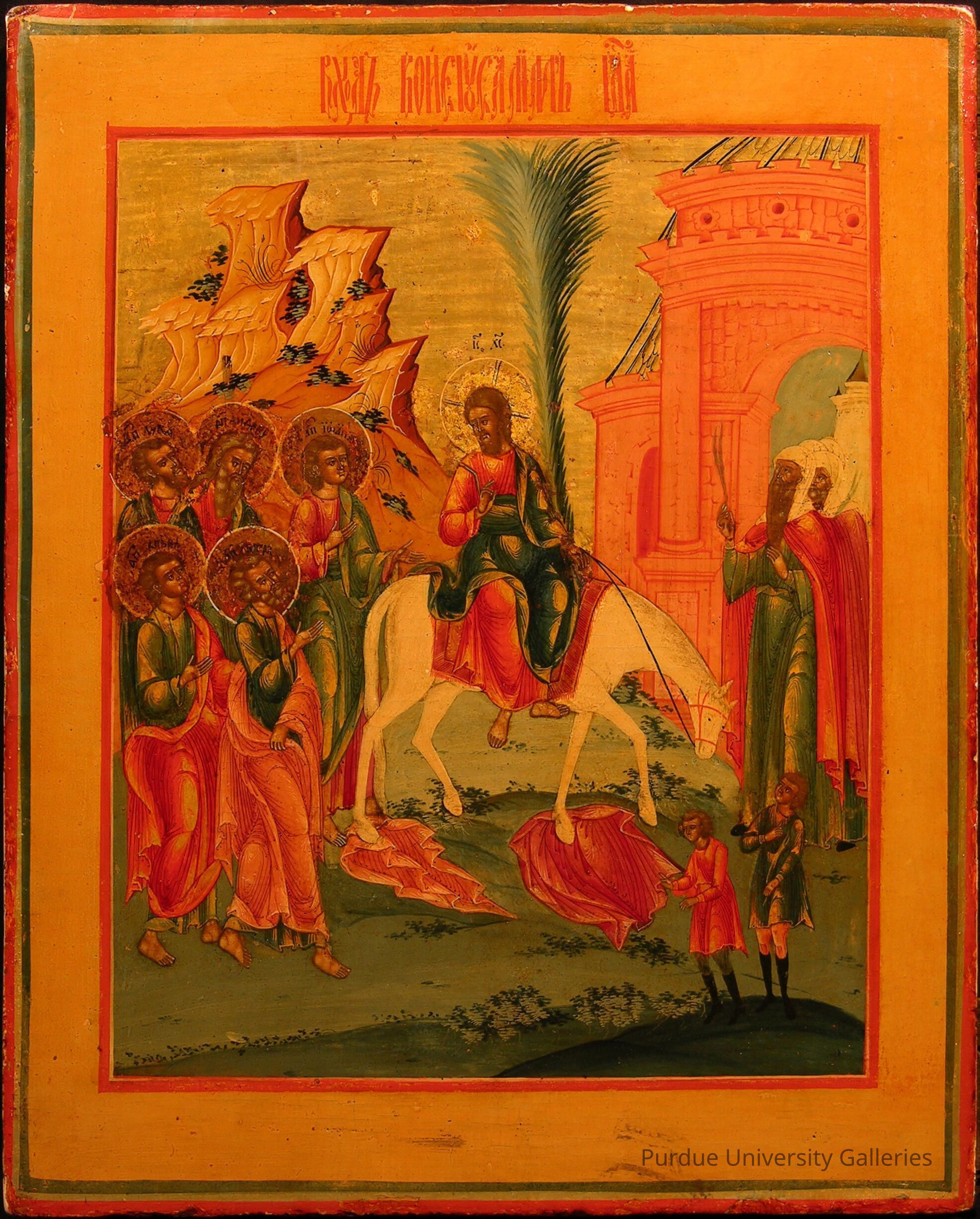 Tempera on curved wooden panel bordered in red, two shades of green, and mustard yellow. A red Cyrillic caption sits in the top center. The focal image shows Jesus clothed in red and green robes with gold line art atop a white horse who treads on orange robes carrying a blue-green palm leaf extending to the top red border. Behind him is a pink brick building and sandy colored mountains. Five men follow him, each adorned with halos and similarly colored robes. Two male children stand in the lower right corner, and behind them a cluster of men stand with white head veils.Type of Painting