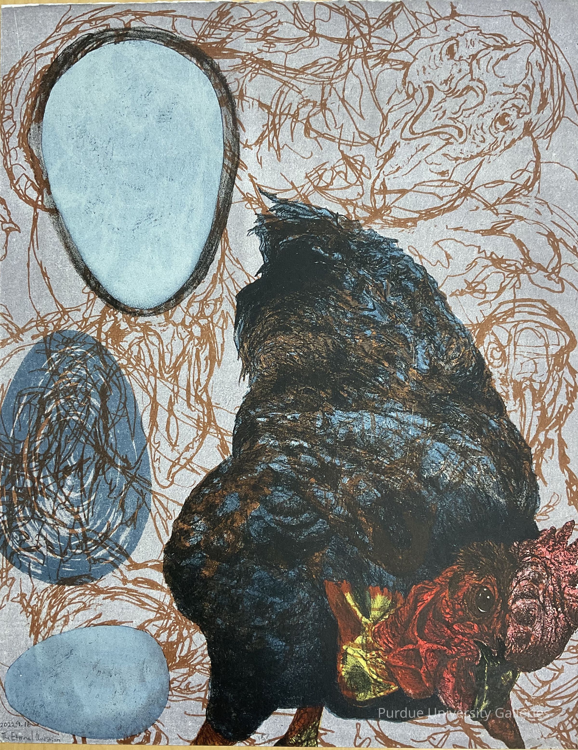 Lithograph print on heavy paper of a chicken in the lower right quadrant with three egs to the left side of print with a purple background. In the background are images of chickens in gold. The chicken in the foreground has black and blue feathering with a red face and comb with a yellow gullet. In the lower, left corner is printed "The Eternal Question" while in the lower, right corner is the artist's signature "Blake Sanders." On the reverse is a second chicken with a green head, black comb, and yellow beack and claw, surrounded in green. The background is gray.