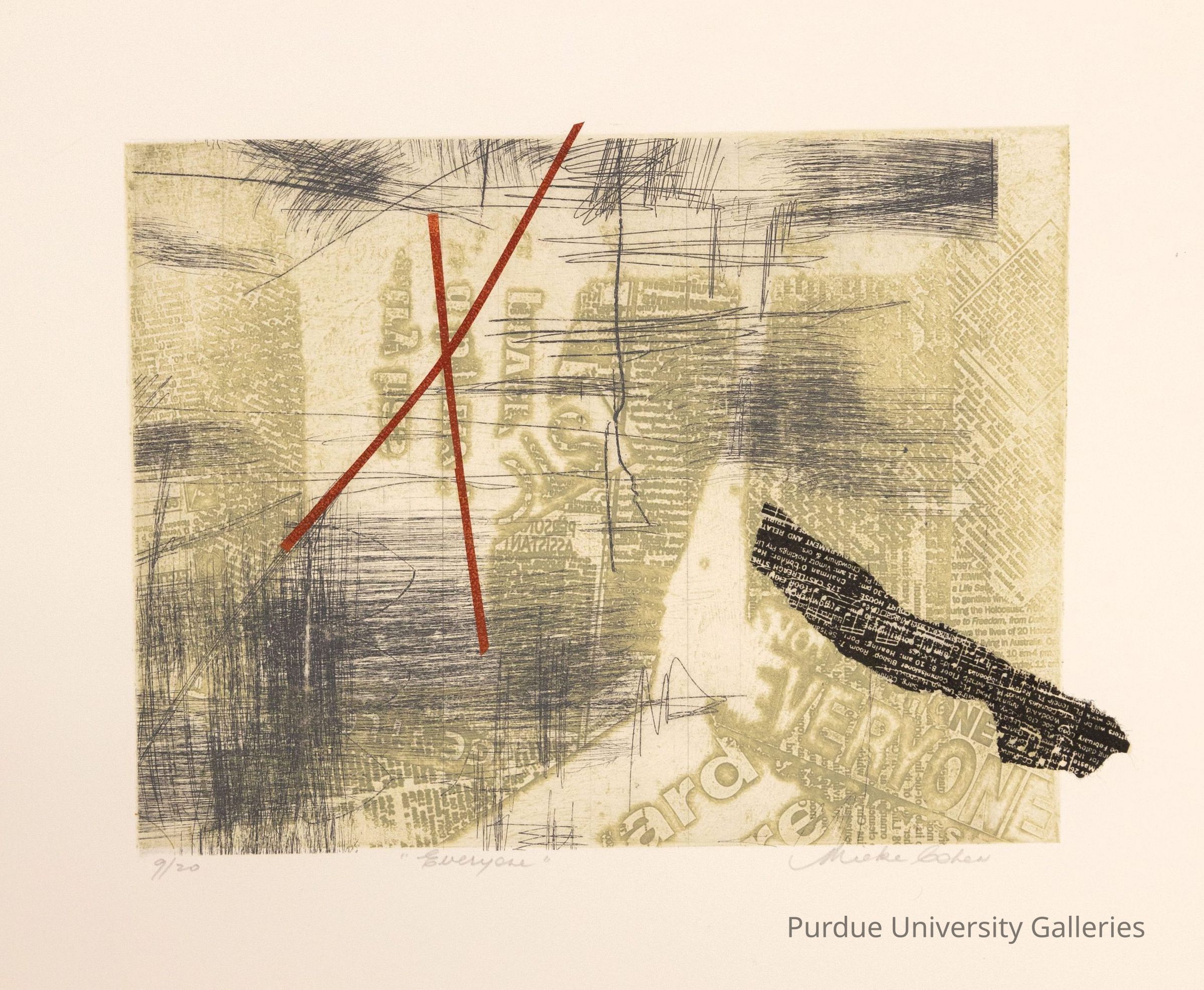 Intaglio print with a background of wording from books and newspaper, overstamped in left hand side with a red X and a slip of music and news artcle on the right hand side in black and white. Gray 'scratching' marks are along the top and extend down the middle to the left and right of the print. Under the print written in pencil is "9/20, "Everyone," Mieke Cohen."Type of Print