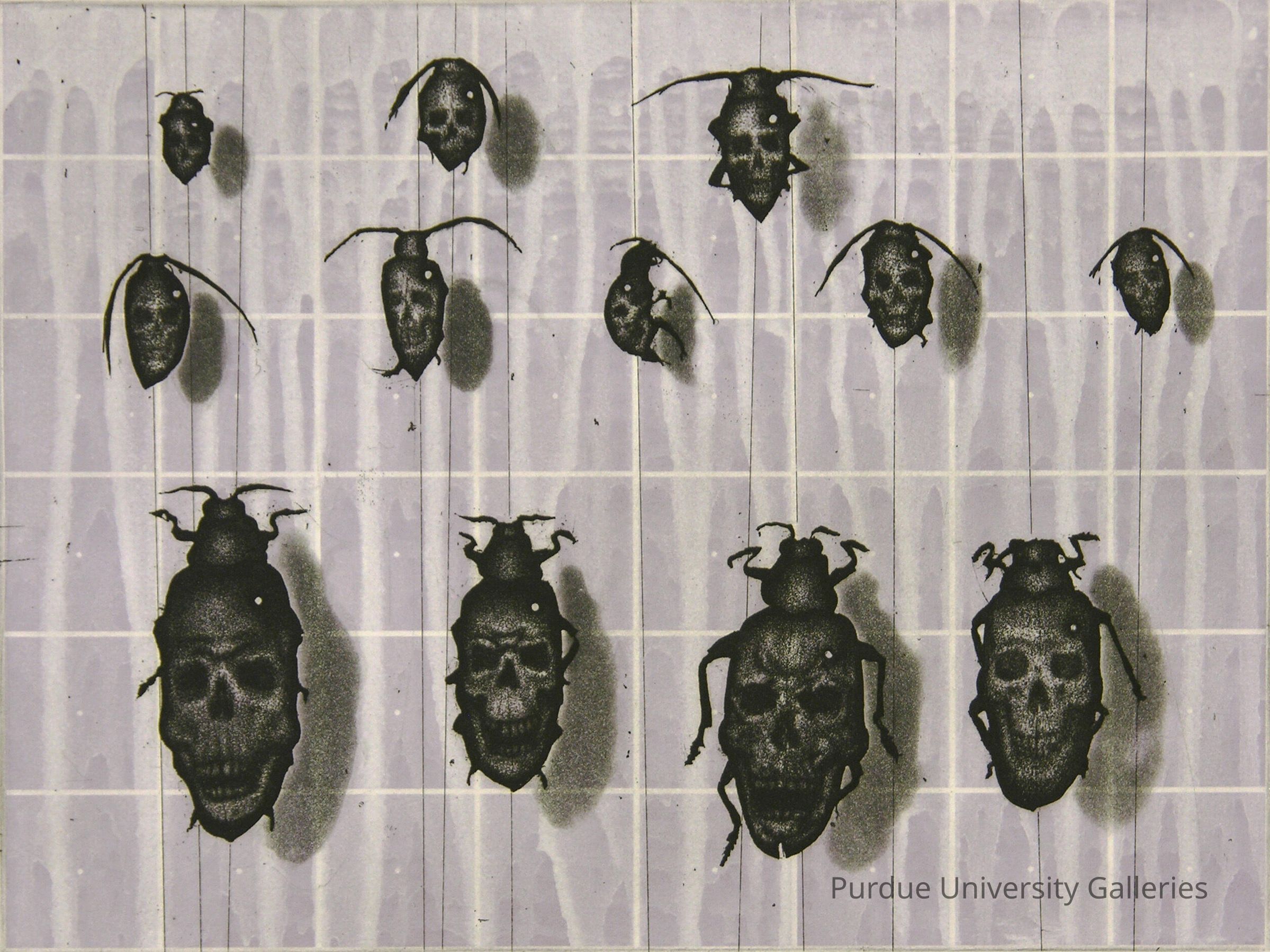The work feature 12 insects with skulls on there backs on a plain background