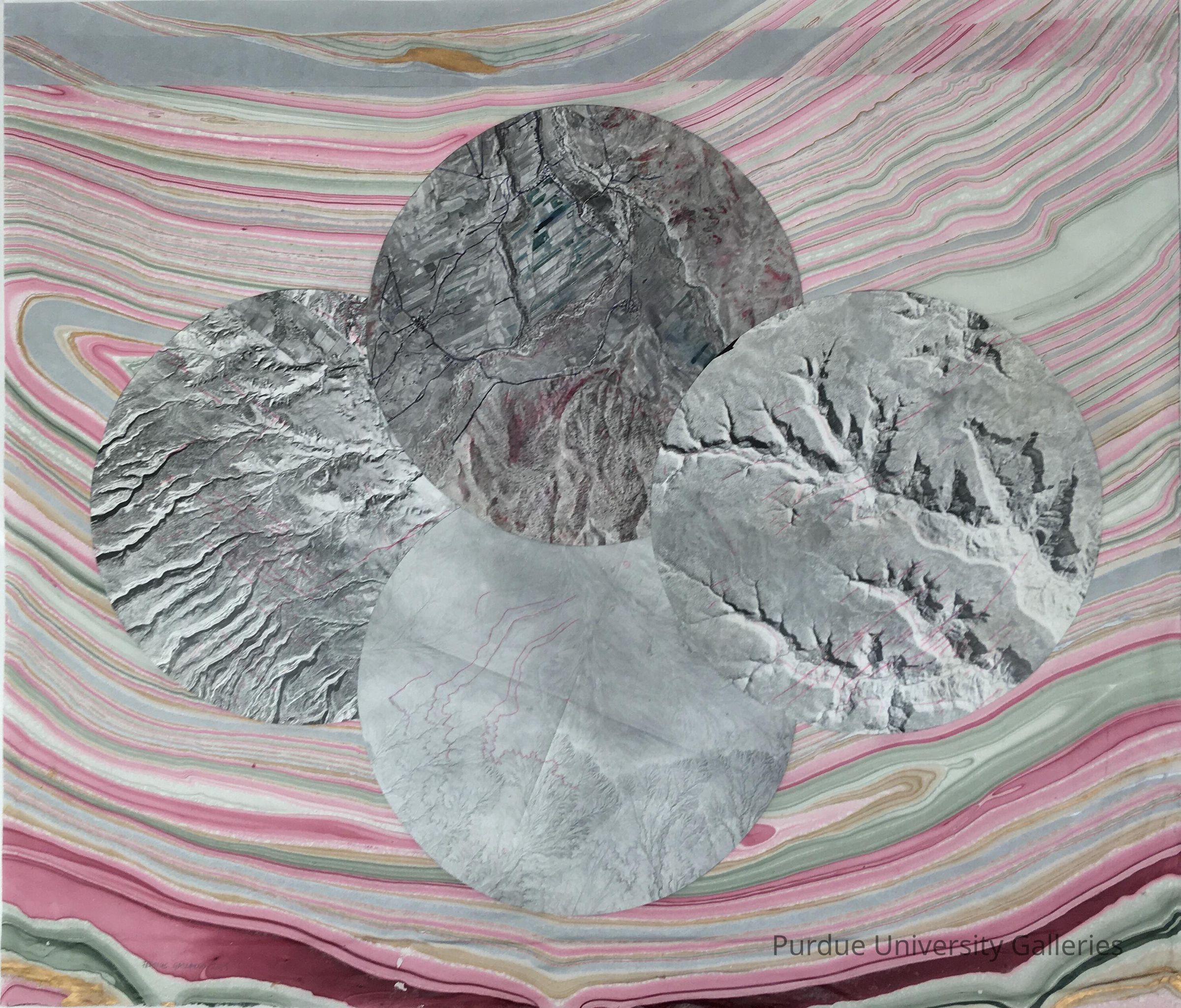 Pink, gray, and white marble-like ground. The background is made with a thick agate pattern out of gold, silver, green and magenta ink. Four gray circles in the center made of photographs of space terrain. They have marks of pink pen and crayon outlining the crevices in the silver gelatin space picture prints.Artwork Details