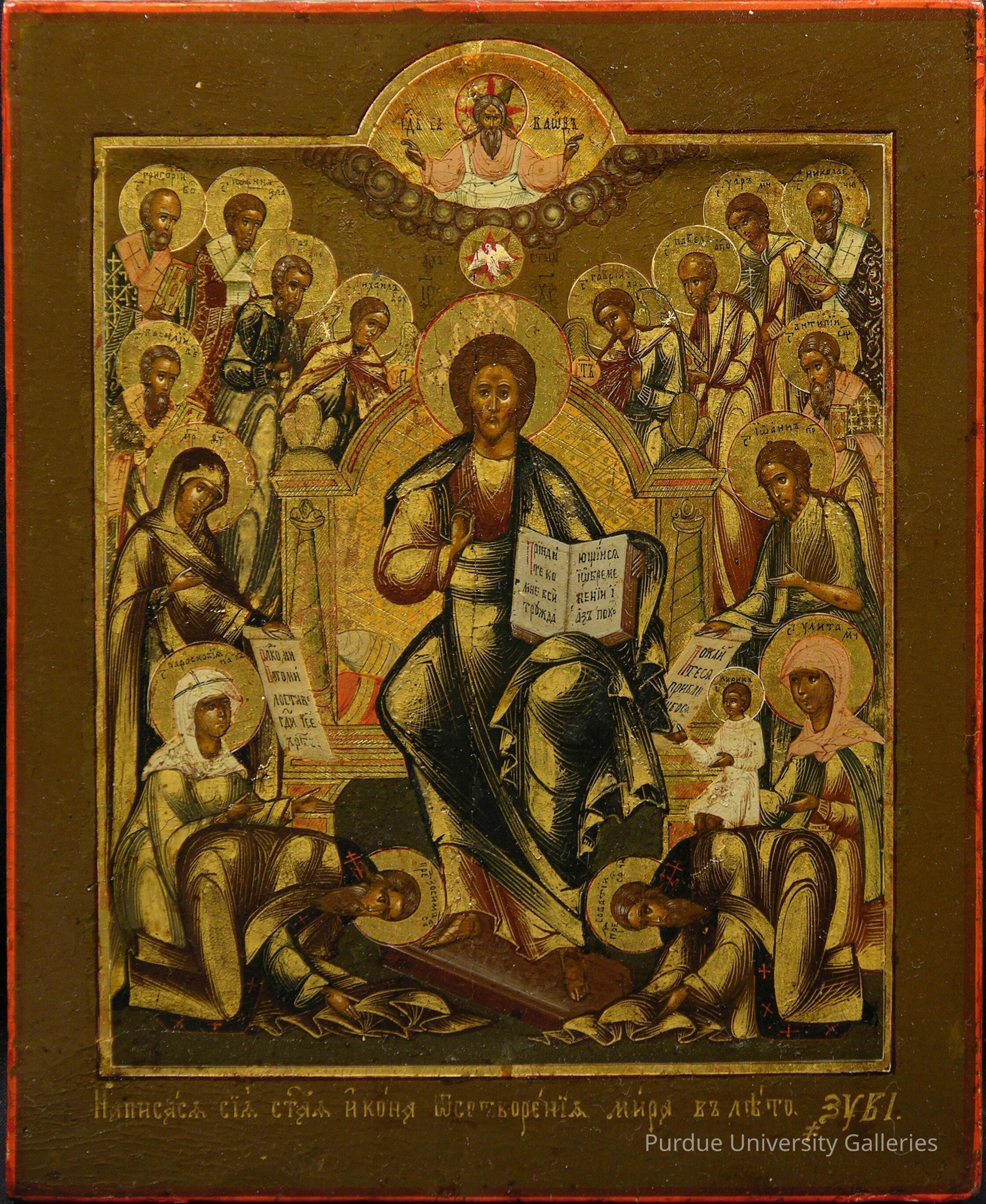 In this version of “The Extended Deesis,” Christ is again enthroned in majesty in the center making a sign of benediction and holding an open Gospel book. To the left and right are the Mother of God and John the Forerunner, who both carry open scrolls. Behind Christ are the Archangels Michael and Gabriel as well as other saints. Immediately above Christ is the Holy Spirit in the form of a dove, above which appears God the Father, with all three forming the Holy Trinity. Four more saints appear at the feet of Christ, notably St. Oulitta and her son Kirik at the bottom right. The scene uses rich browns, and the forms are crisply painted.