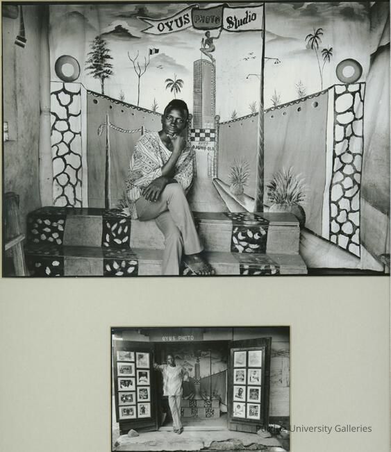 Oyus poses inside his photo studio located in Africa. On the top image Oyus sits on the bench legs crossed and head on hand. He stares at the camera as the backdrop leads to a vantage point of a woman on a tower. The studio has a unique background as there are various vantage points and architecture style. The second photo is half the length of the above photo. THe small photo shows Oyus leading on a door to the studio. This image shows the small size of the studio with just the bare necessities. The doors are open and display Oyus's portrait work.Photograph Details