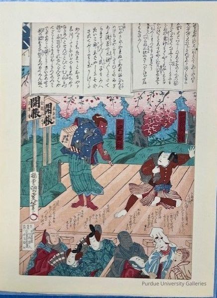 Japanese print with writing along the top. Images are of a play with 2 men on a stage and 7 people below.