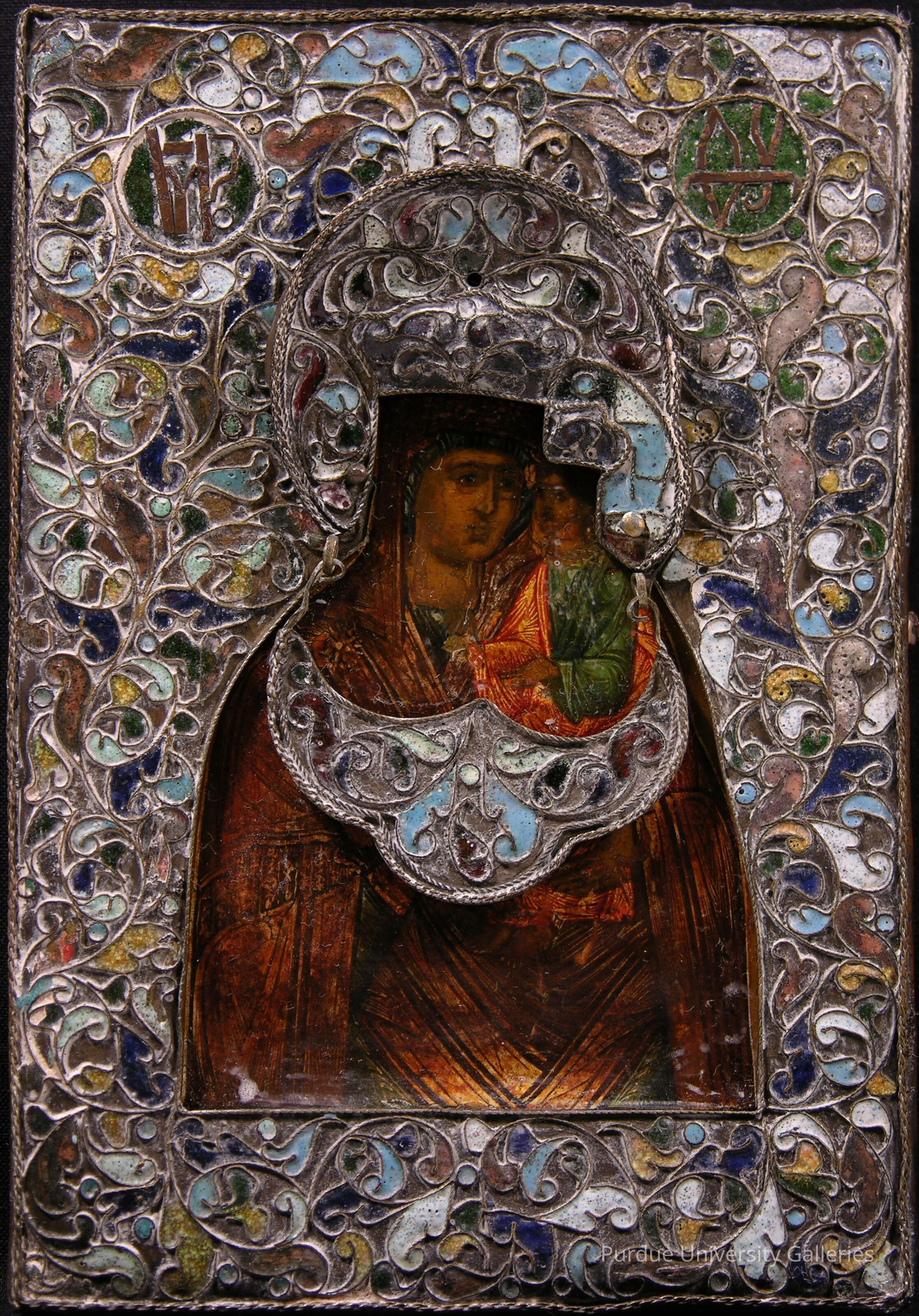 The riza is decorated with cloisonné enamel in a scrolling foliate pattern in shades of opaque and mottled navy blue, turquoise, white, cream, pale pink, and mustard yellow together with translucent purple and green. The riza includes a crescent-shaped tsata resembling a necklace and is suspended from the halos with metal loops. The enamel ornament conforms with that of the riza, indicating that they were made at the same time as a set. At upper left and right are roundels with the Greek letters ΜΡ ΘΥ formed from metal strips set against a translucent green enamel ground. These letters are an abbreviation for the Greek words Μήτηρ Θεού (Meter Theou) meaning “Mother of God.”Type of Painting