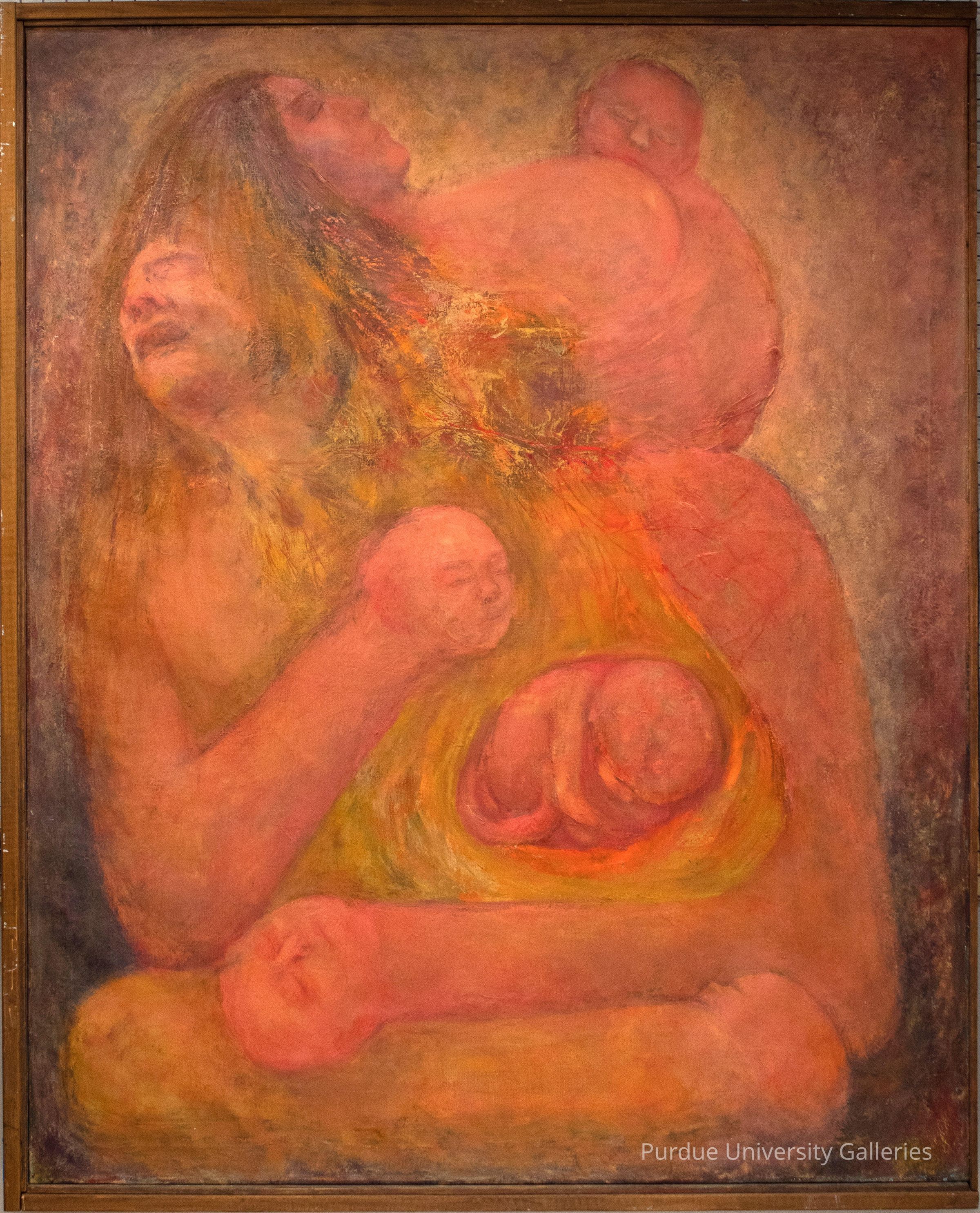This painting has two distinct figures, but many more faces in it. The two figures are on the left hand side of the painting. They both look to be female. The top figure look pregnant and seems to be holding another child. The bottom figure is also pregnant and you can see the child in the womb. This figure's hands look to be faces. The woman on top is calm while the woman on the bottom appears to be in agony.Acquisition
