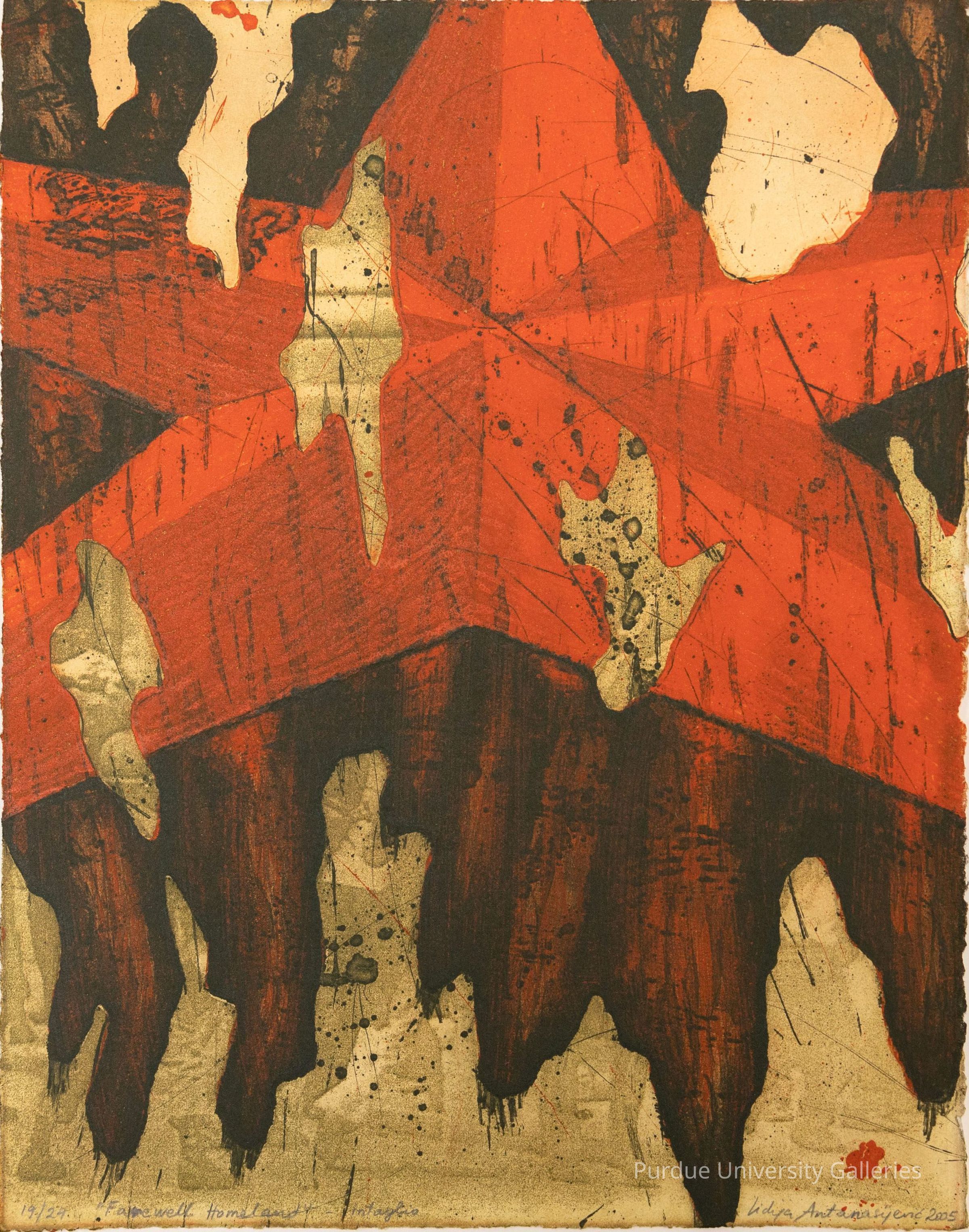 Print of red star with missing areas on a background of tan and brown. At bottom, right hand corner in pencil is hand written "Lidija Antanasijevic, 2005" and to the bottom, left in pencil is written "19/24 "Farewll Homland - Intaglio"Type of Print