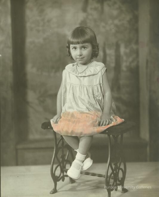 A little girl, no older than eight, sits on a small bench as she looks at the camera. She wears a babydoll styled plain summer dress, that looks to be intentionally colored by the photographer on the bottom half. The bottom of the dress is colored a light pinkish/orange, but only on the dress as the hands have no colors. The little girl sits with her ankles crossed and white strap across shoes. The background seems to be an out-of-focus paneled wall.Photograph Details
