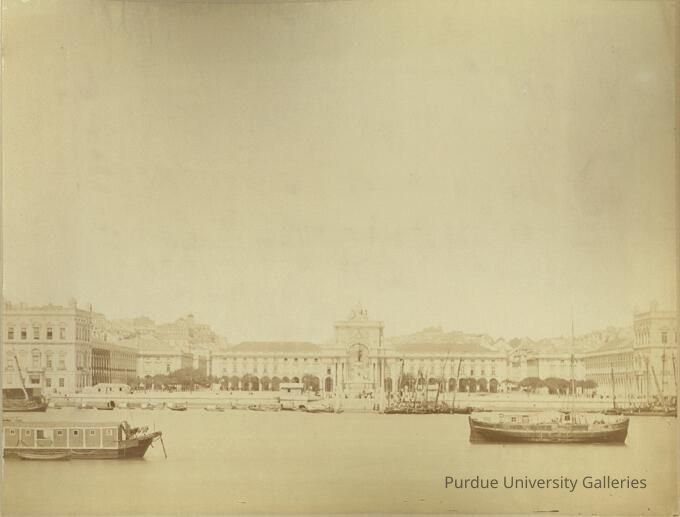 The photographer captures the city of Lisbon from the water. The port is in the foreground with Praça do Comércio in the background. There are a couple house boats in the water with more boats tied to the port. The Praça do Comércio is a plaza that faces the port as identified by the Arco da Rua Augusta; the arch signifies the landmark around the plaza.Faint in the image is the Equestrian Statue of King José I; viewers can see the statue framed center of the arch.Photograph Details