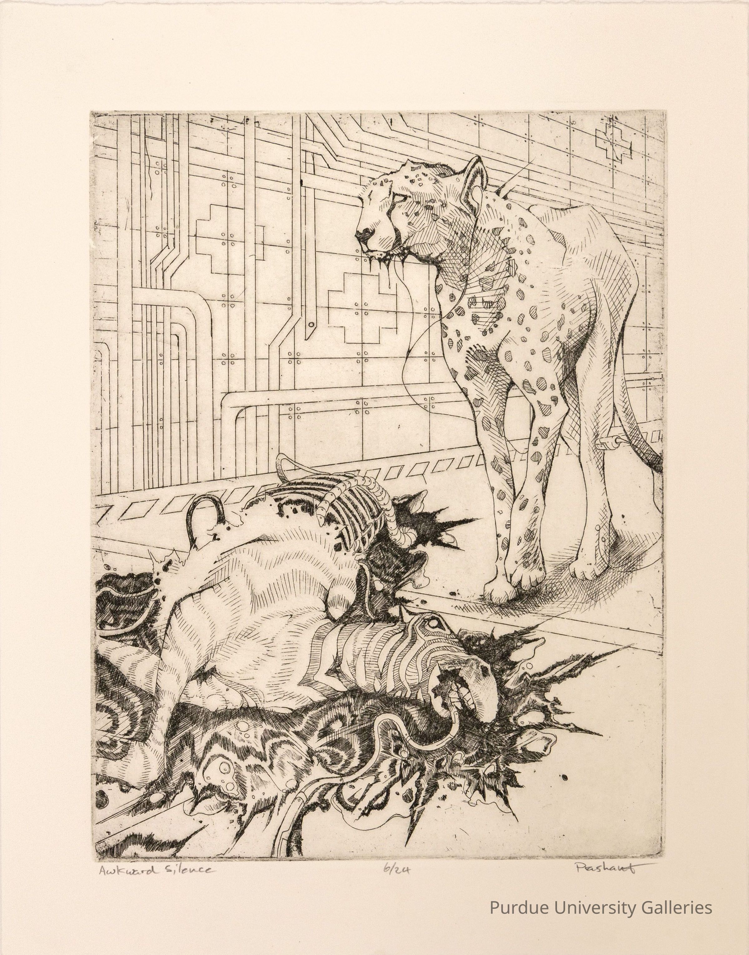 In black ink a jaguar is standing over the carcass of a dead zebra whose hindquarters is only exposed bones. The jaguar has earphones in his ears of which the cord extends down between the jaguar's front leges. Another corded set of earplugs appear to connect in to the jaguar's proper left back leg. The zebra has a cord extending along it's back and through its body out through its mouth. In the background is what appears to be an electronic board. Below the image in pencil is "Awkward Silence, 6/24, Prashant."Acquisition