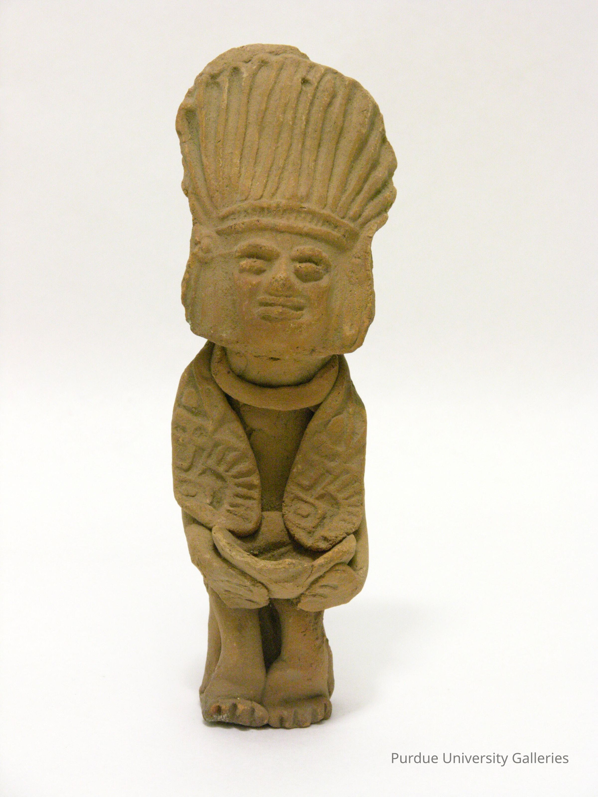 Clay figurine of human-like being. The mark making of this piece is bold and thick with patterns making up for face shapes. As it says in the title it's a Native American Object and it resembles much of that style. This figure has similar colors to its other pieces. This piece has marks that appear to be aging or possibly molding. The head matches the shape of the rest of its body. The back of the head and the back itself are mainly flat with slight curves making the figure look hunched over. The pieces of clay together do not appear to be scored together or blended together. The back appears to be one big panel with a thin molded head into the back. Squished as well, maybe intentionally for texture and appearance. The eyes, nose and mouth are rather small in comparison to its entire face and hat/hair. It sits not taking up much space. The figure wears a necklace and has hands at the bottom carrying a bowl maybe. The legs have toes attached to the feet.