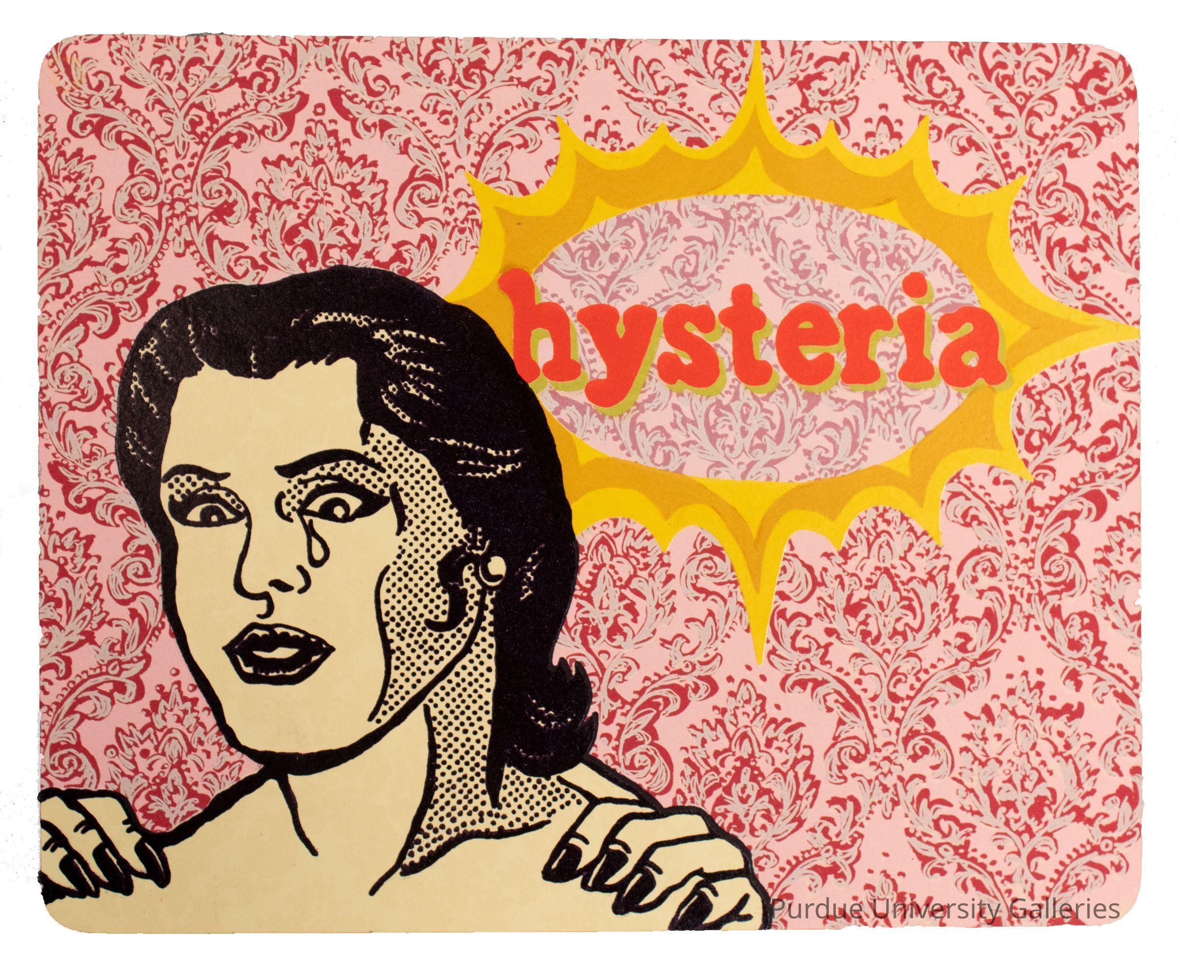 8" x 10" cardstock printed on both sides. Side A has a pink wallpaper background with a woman's head and shoulders in the left foregrounds who has hands resting on her shoulders that have black fingernails. The woman is crying. Behind the head of the woman is a an oval in gold color with the word "hysteria" printed in red and green. Side B has the same wallpaper pattern ias a background but the colors are yellow, green and blue. A baby holding a group of ballons (red, orange and yellow) appear to be lifting the baby across the page from right to left. Along the edge of the cardstock in black is "An out-of-door lfie is the best cure for hysteria." Below this, and dfficult to make out, printed in pencil from left to right "Flashcard #1," "14/20," " K. Maswell."Type of Print