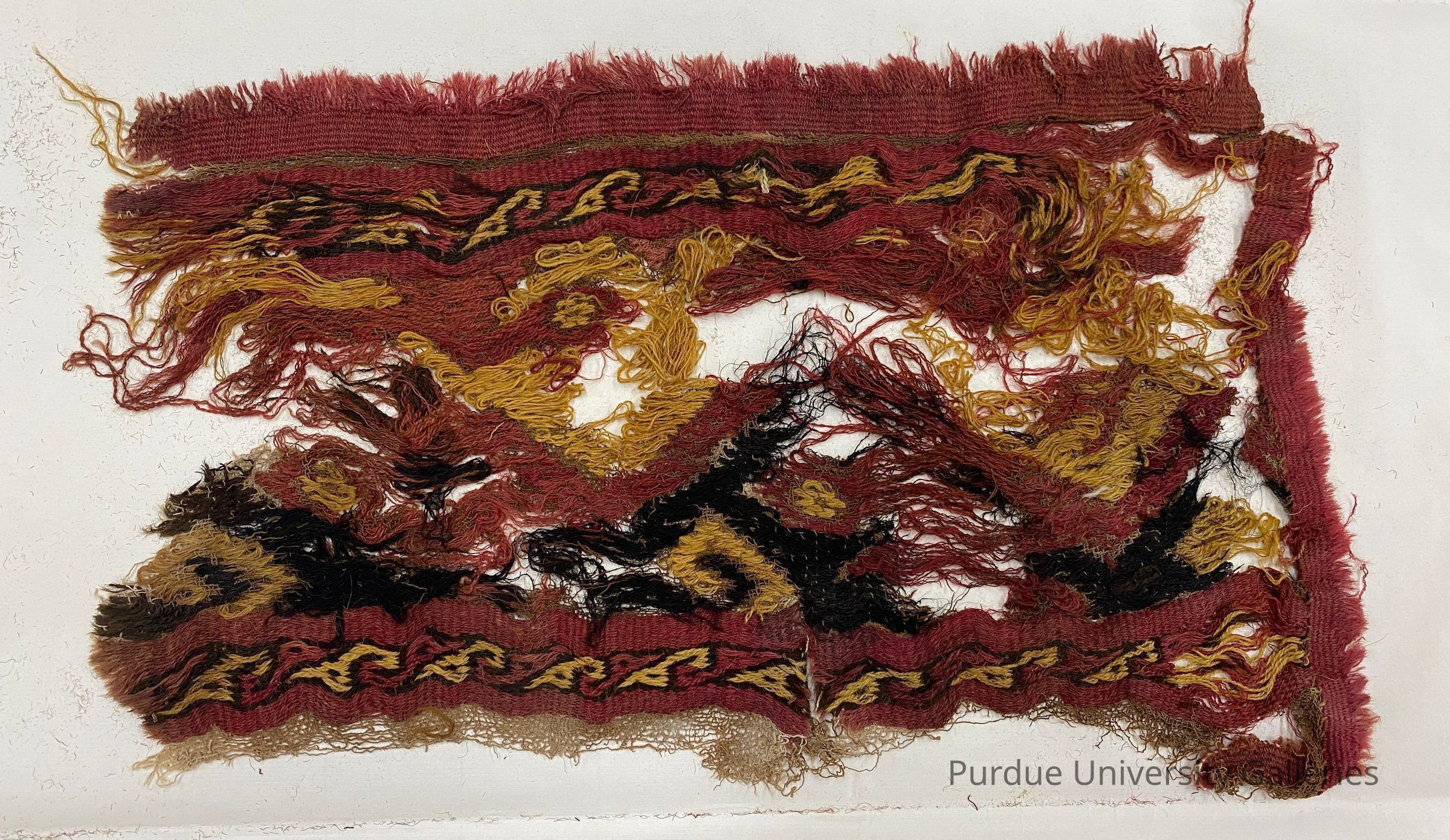 Textile fragment in brocade technique with stylized bird and wave motifs. Red, black, yellow, and brown. Woven alpaca wool and cotton.Acquisition