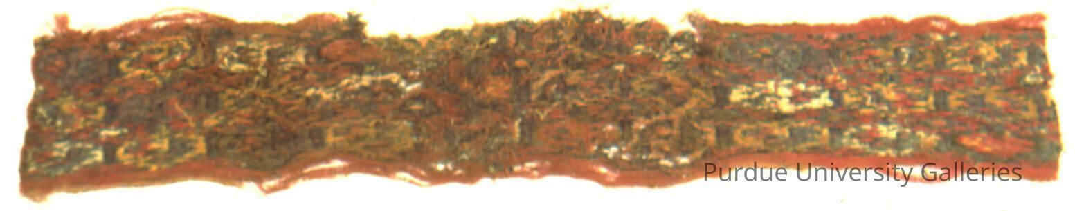 Textile fragment in multi-weft brocade technique with stylized bird motifs in red, yellow, blue, white, and purple.Acquisition