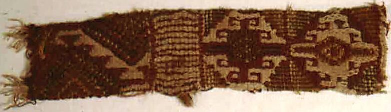 Textile fragment, possibly from sampler utilizing various complicated techniques, including warp and weft-faced. Red, white, green, gold, and black.Acquisition