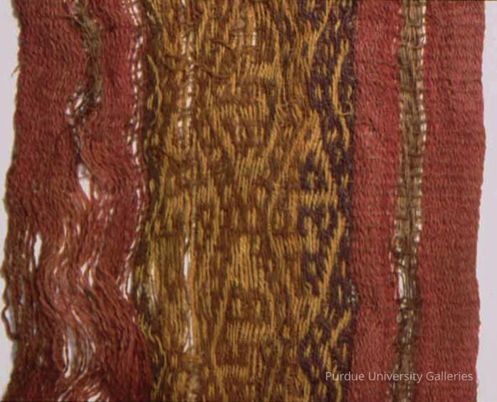 Textile border in multi-warp pick up, with stylized serpents in gold and brown with red borders.Acquisition