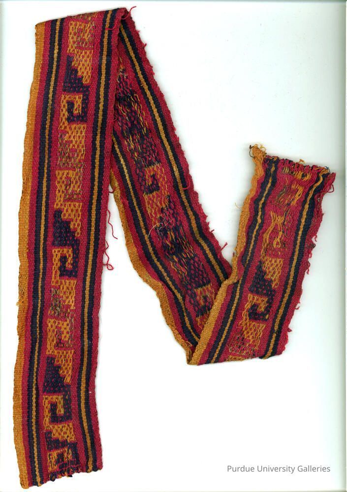 Textile border in warp-face pick-up technique, with wave motifs in red, yellow, blue, and white. White yarn is finer than alpaca.Acquisition